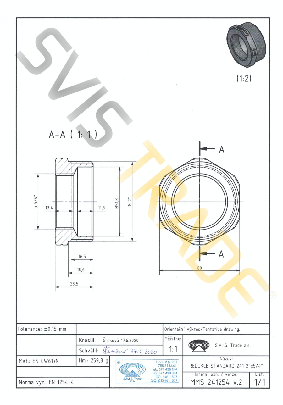 Navojni mesingani fiting, tip – Redukcija sa cijevnim navojima unutarnji-vanjski, bez površinske obrade. Spojni navoj G paralelan je spajanju, ne brtvljenju, na navoje sukladno ISO 288-1. Proizvedeno prema normi EN 1254-4.