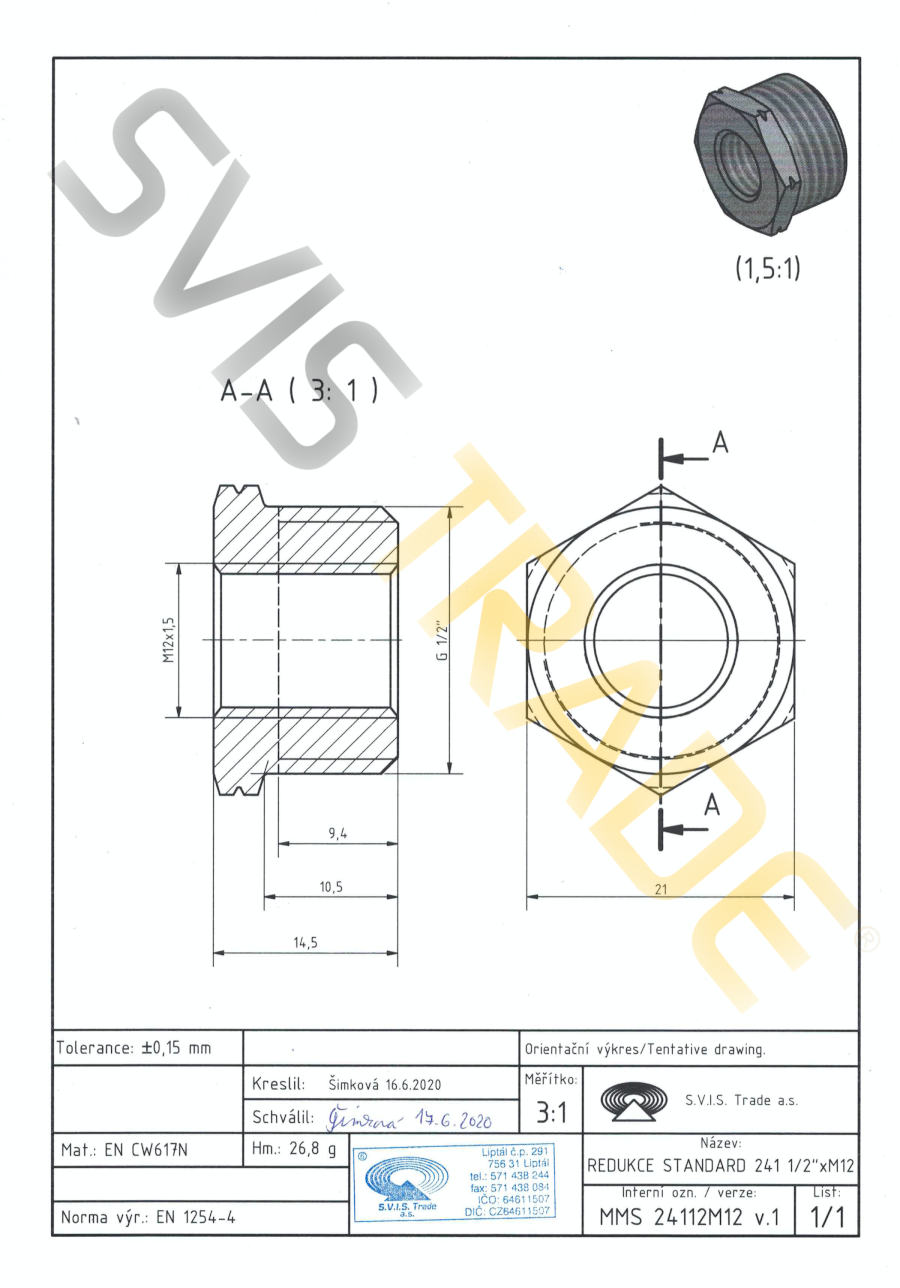 Navojni mesingani fiting, tip – Redukcija sa cijevnim navojima unutarnji-vanjski, bez površinske obrade. Spojni navoj G paralelan je spajanju, ne brtvljenju, na navoje sukladno ISO 288-1. Proizvedeno prema normi EN 1254-4.