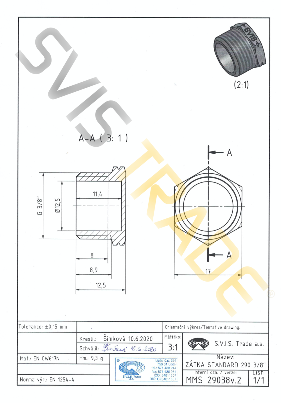 Navojni mesingani fiting, tip – Čep sa heksagonom sa cijevnim navojima vanjski, bez površinske obrade. Spojni navoj G paralelan je spajanju, ne brtvljenju, na navoje sukladno ISO 288-1. Proizvedeno prema normi EN 1254-4.