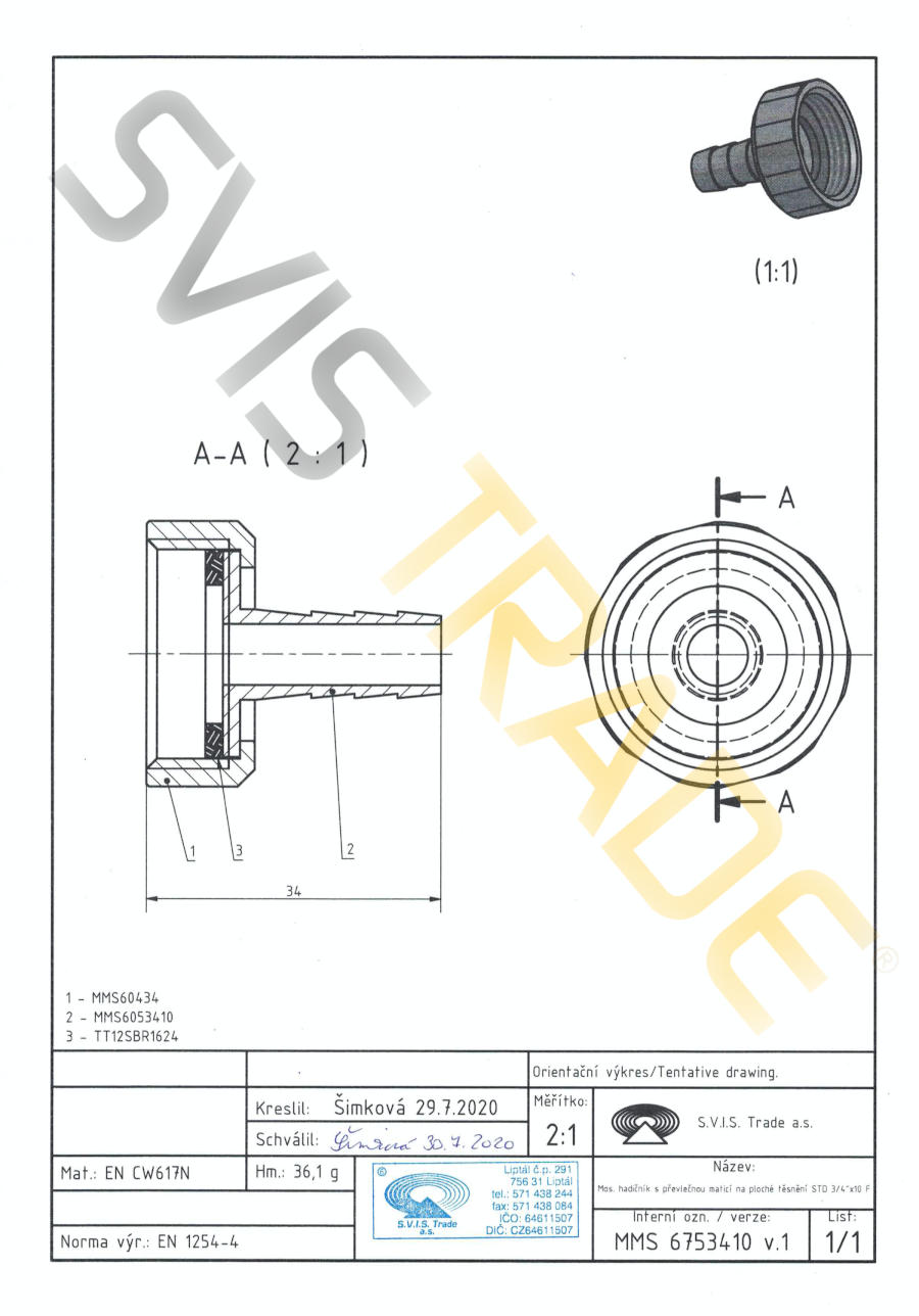 Mesingani adapter za crijevo s maticom F - 675 MMS - STANDARD. Izrađen prema EN 1254-4  s navojem - mesingani adapter za crijevo s navojem (adapter crijeva) s cjevastim cilindričnim navojem G unutarnje prema ISO 228-1. Bez površinske obrade.