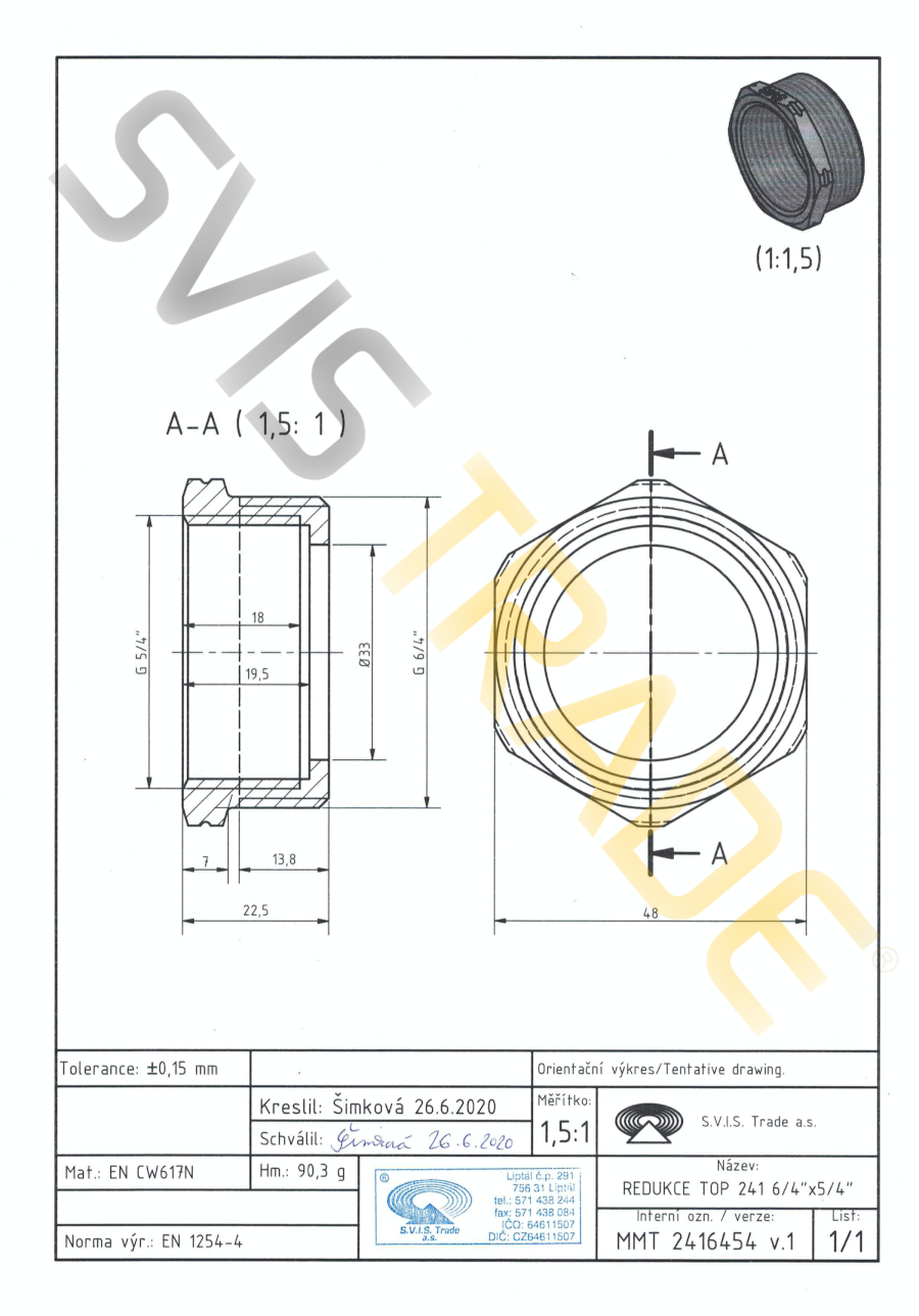 Navojni mesingani fiting, tip – Redukcija sa cijevnim navojima unutarnji-vanjski, bez površinske obrade. Spojni navoj G paralelan je spajanju, ne brtvljenju, na navoje sukladno ISO 288-1. Proizvedeno prema normi EN 1254-4.