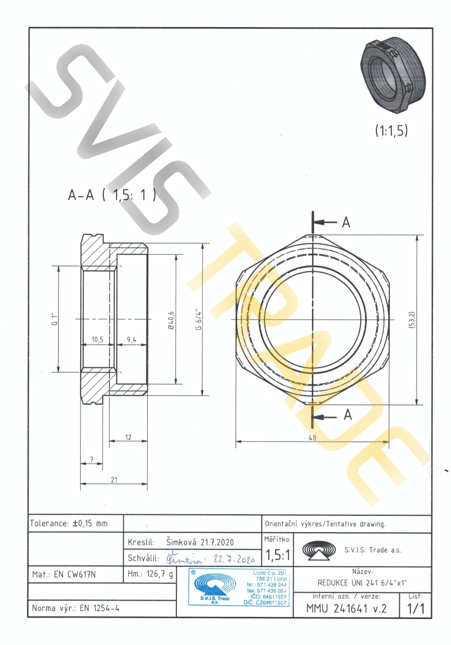 Navojni mesingani fiting, tip – Redukcija sa cijevnim navojima unutarnji-vanjski, bez površinske obrade. Spojni navoj G paralelan je spajanju, ne brtvljenju, na navoje sukladno ISO 288-1. Proizvedeno prema normi EN 1254-4.