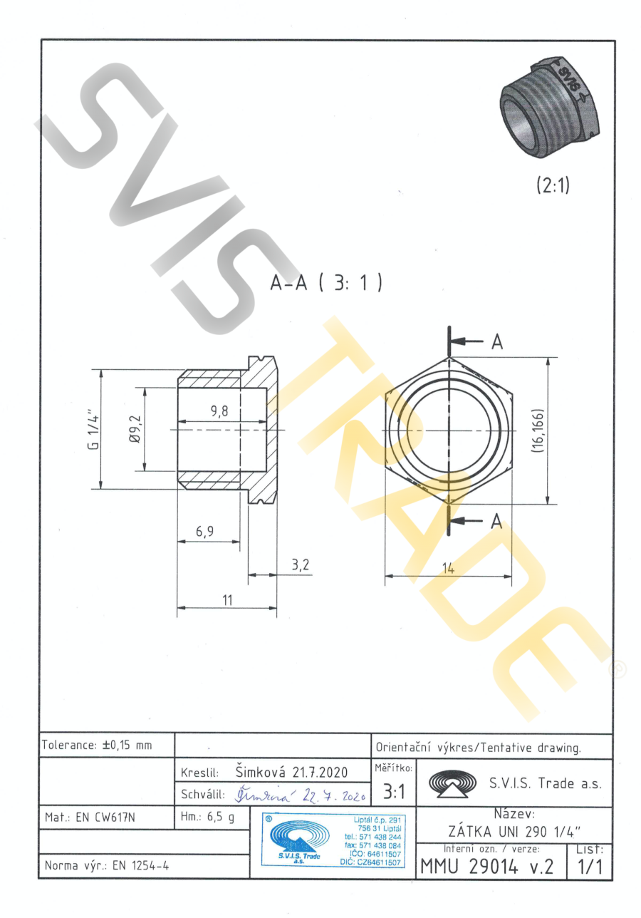 Filetul fitingurilor din alama,tip-dop cu hexagon,cu filetele tevii exterioare,fara tratament de suprafata.Conectarea filetelor G,sunt paralele pentru unirea(imbinarea) nu etansarea pe filete in conformitate cu ISO 228-1.Produse in conformitate cu EN 1254-4.