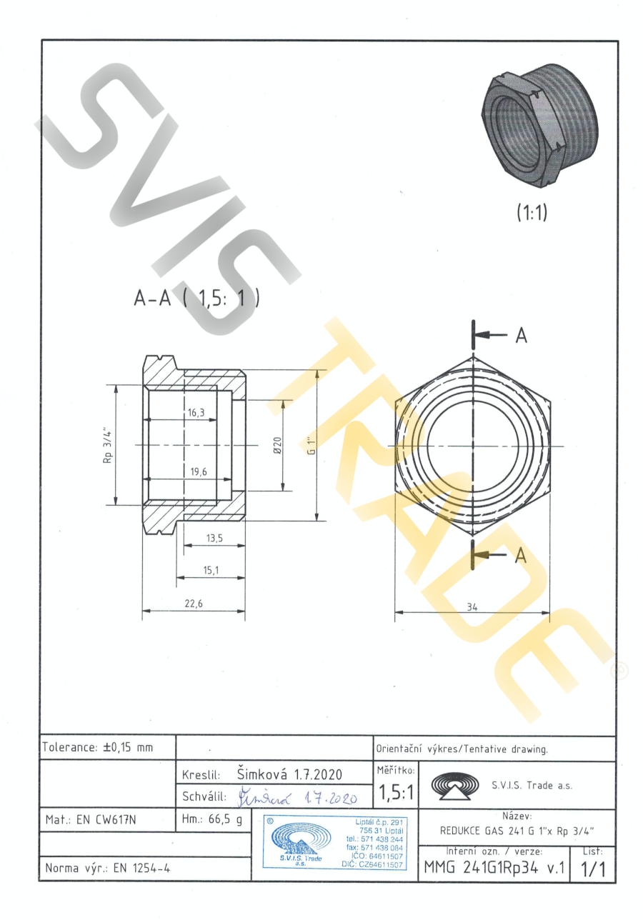 Závitová tvarovka z mosadze, druh - redukcia (prechod) s rúrkovým závitom vonkajším a vnútorným, bez povrchovej úpravy. Pripojovacie závity sú R kónické tesniace na závitoch podl'a ISO 7-1. Vyrobené podl'a normy EN 1254-4. Voda a vodní roztoky: od 1/8" do 3/4" 2,5 MPa do 120 °C; 1,6MPa do 220°C od 1" do 4" 1,6 MPa do 120°C; 0,6 MPa do 220°C Horl'avé plyny: od 1/8" do 4" 0,5MPa Technické plyny: od 1/8" do 4" 1,6 MPa nutnosť zamezit zamrznutí média. Použitie: Určené pre použitie v potrubných rozvodoch vody (vrátane vody určenej pre ľudskú spotrebu), vzduchu a ďalších neabrazívnych a neagresívnych médií s najvyšším pracovným pretlakom 1,6 MPa pri teplote media od 0 ° C do + 120 ° C.