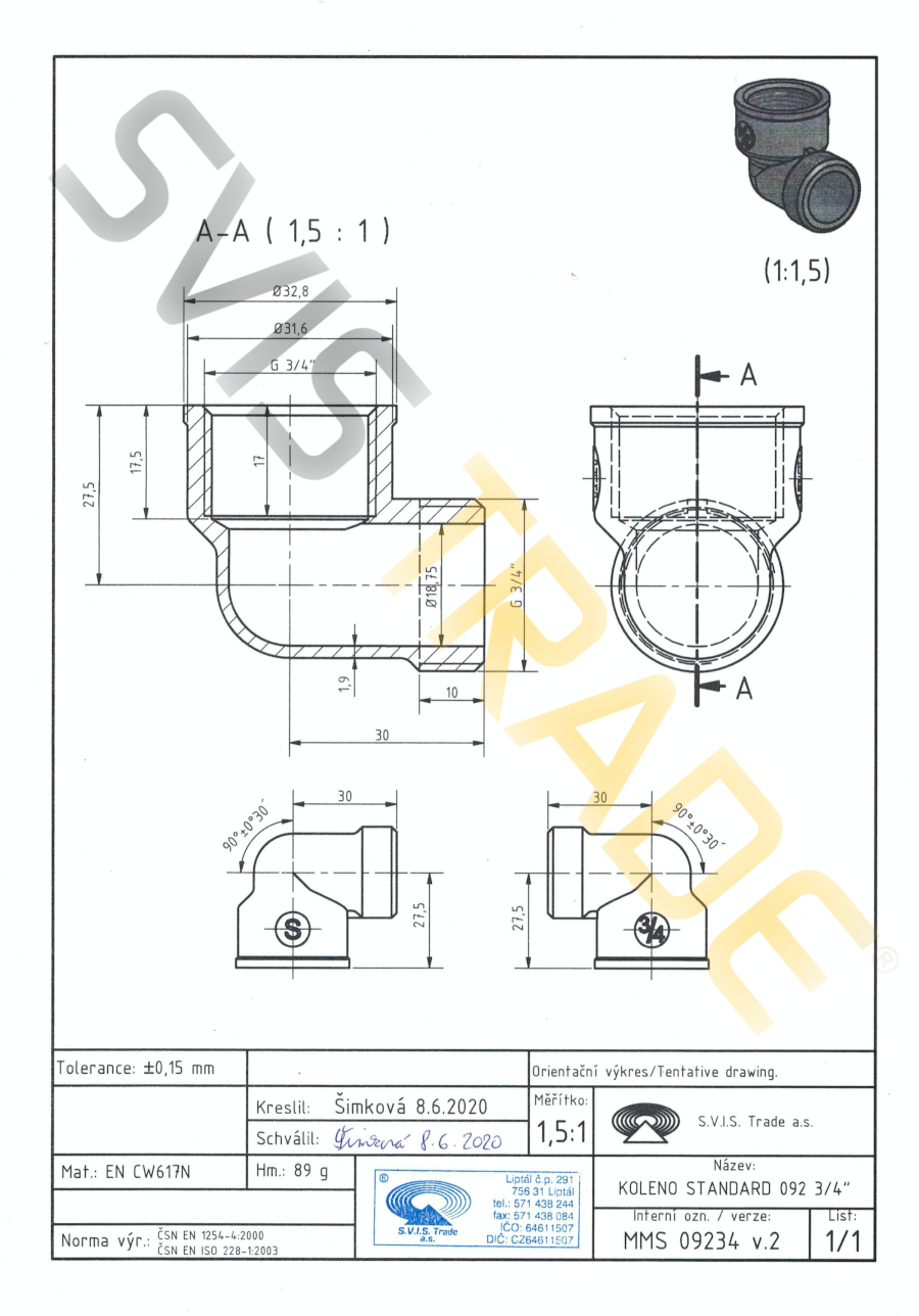 Závitová tvarovka z mosadze, druh - koleno 90 ° s rúrkovými závitmi vnútorné x vonkajšie, bez povrchovej úpravy. Pripojovacie závity G sú valcové pre spoje netesniace na závitoch podľa normy ISO 228-1. Vyrobené podľa normy EN 1254-4.