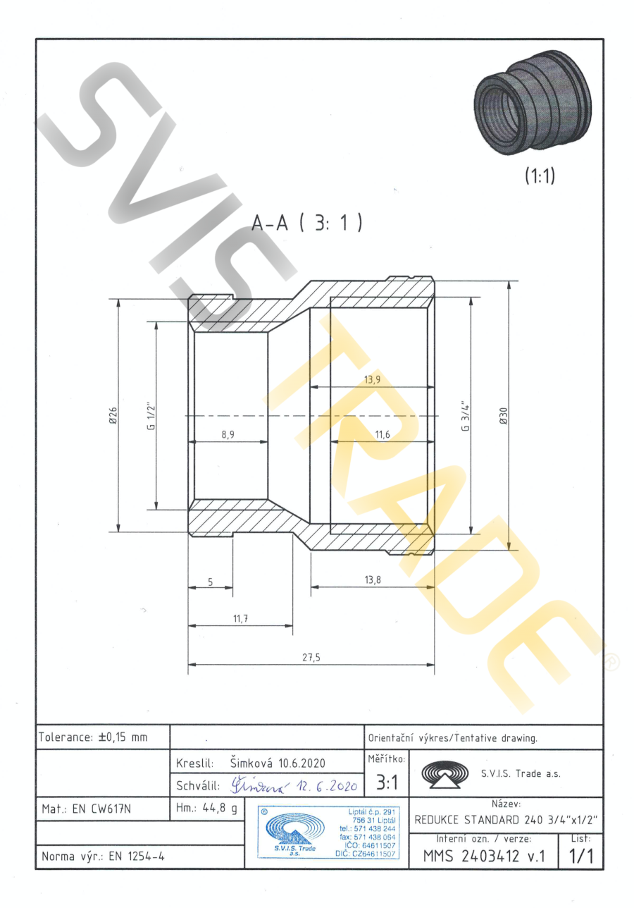 Závitová tvarovka z mosadze, druh - nátrubok s redukovaným priechodom s rúrkovými závitmi vnútorný x vnútorný, bez povrchovej úpravy. Pripojovacie závity G sú valcové pre spoje netesniace na závitoch podľa normy ISO 228-1. Vyrobené podľa normy EN 1254-4.