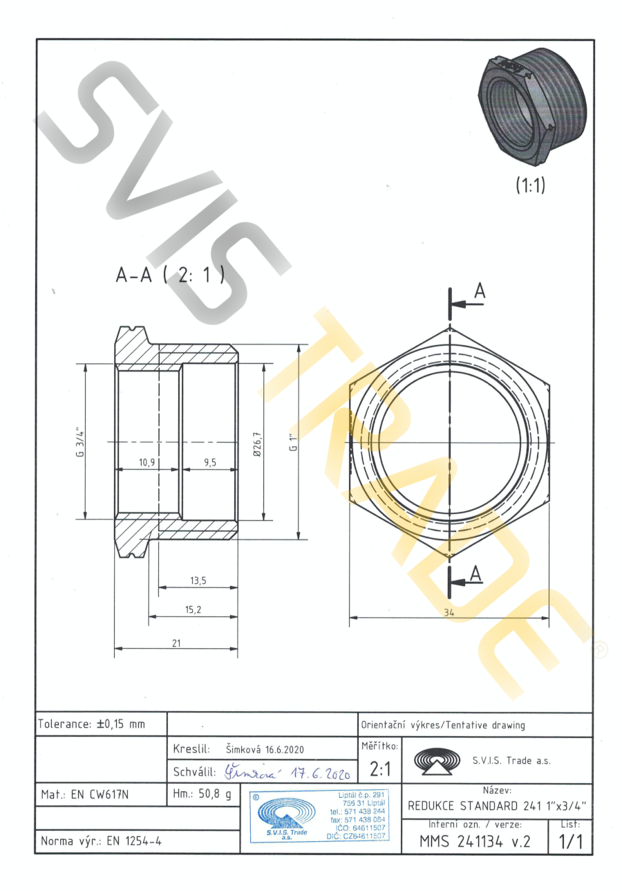 Závitová tvarovka z mosadze, druh - redukcia (prechod) s rúrkovými závitmi vnútorné x vonkajšie, bez povrchovej úpravy. Závity sú valcové pre spoje netesniace na závitoch podľa normy ISO 228-1. Vyrobené podľa normy EN 1254-4.