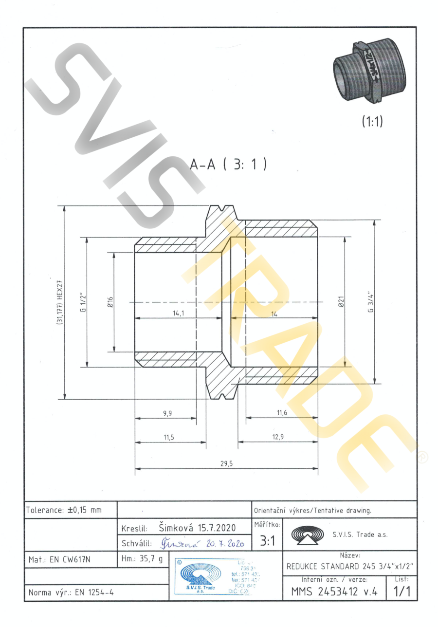 Závitová tvarovka z mosadze, druh - vsuvka redukovaná s rúrkovými závitmi vonkajšie x vonkajšie, bez povrchovej úpravy. Závity sú valcové pre spoje netesniace na závitoch podľa normy ISO 228-1. Vyrobené podľa normy EN 1254-4.