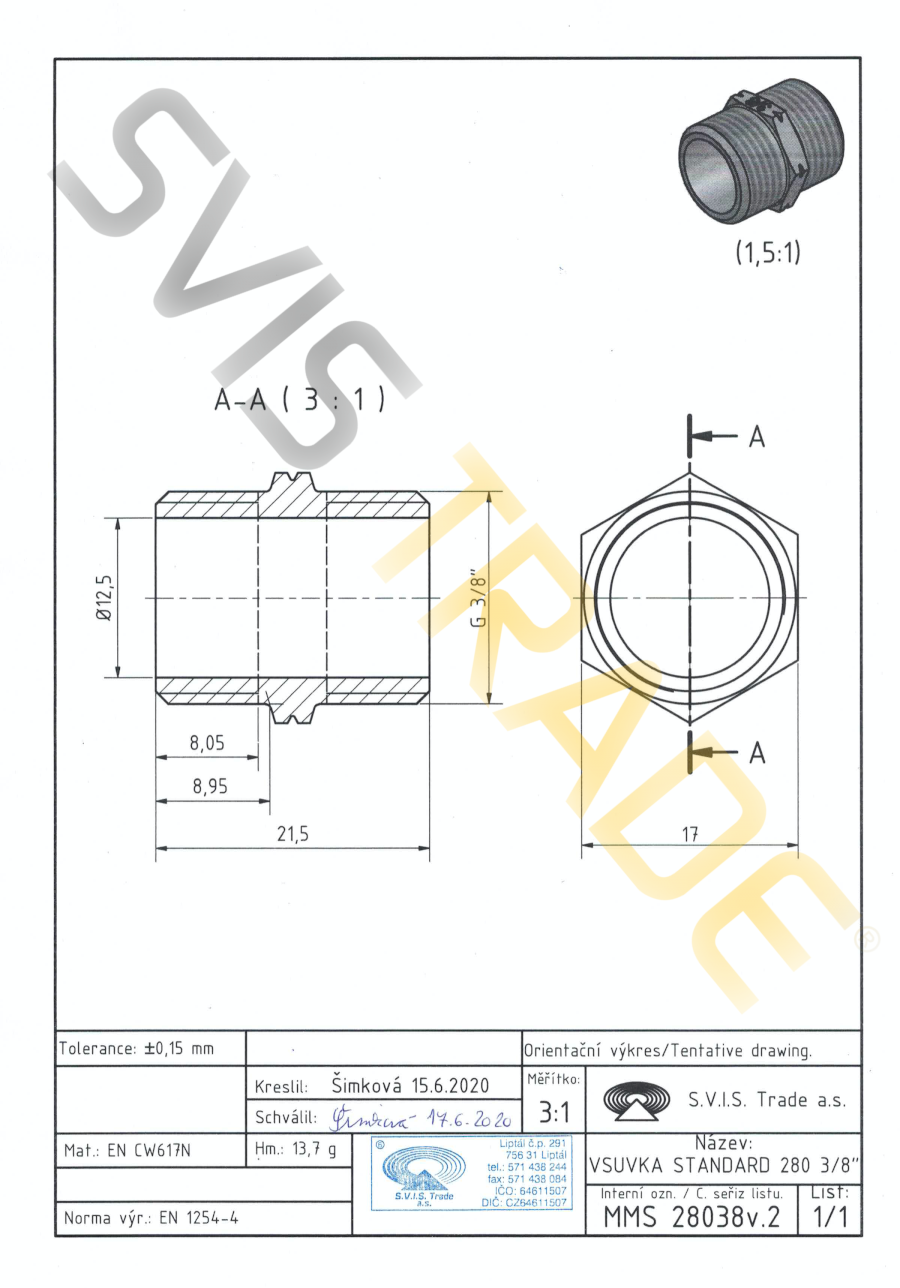 Závitová tvarovka z mosadze, druh - vsuvka s 6-hranom, s rúrkovými závitmi vonkajšie x vonkajšie, bez povrchovej úpravy. Pripojovacie závity G sú valcové pre spoje netesniace na závitoch podľa normy ISO 228-1. Vyrobené podľa normy EN 1254-4.