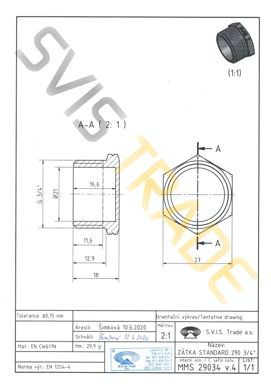 Závitová tvarovka z mosadze, druh - zátka s 6-hranom, s rúrkovým závitom vonkajším, bez povrchovej úpravy. Pripojovacie závity G sú valcové pre spoje netesniace na závitoch podľa normy ISO 228-1. Vyrobené podľa normy EN 1254-4.