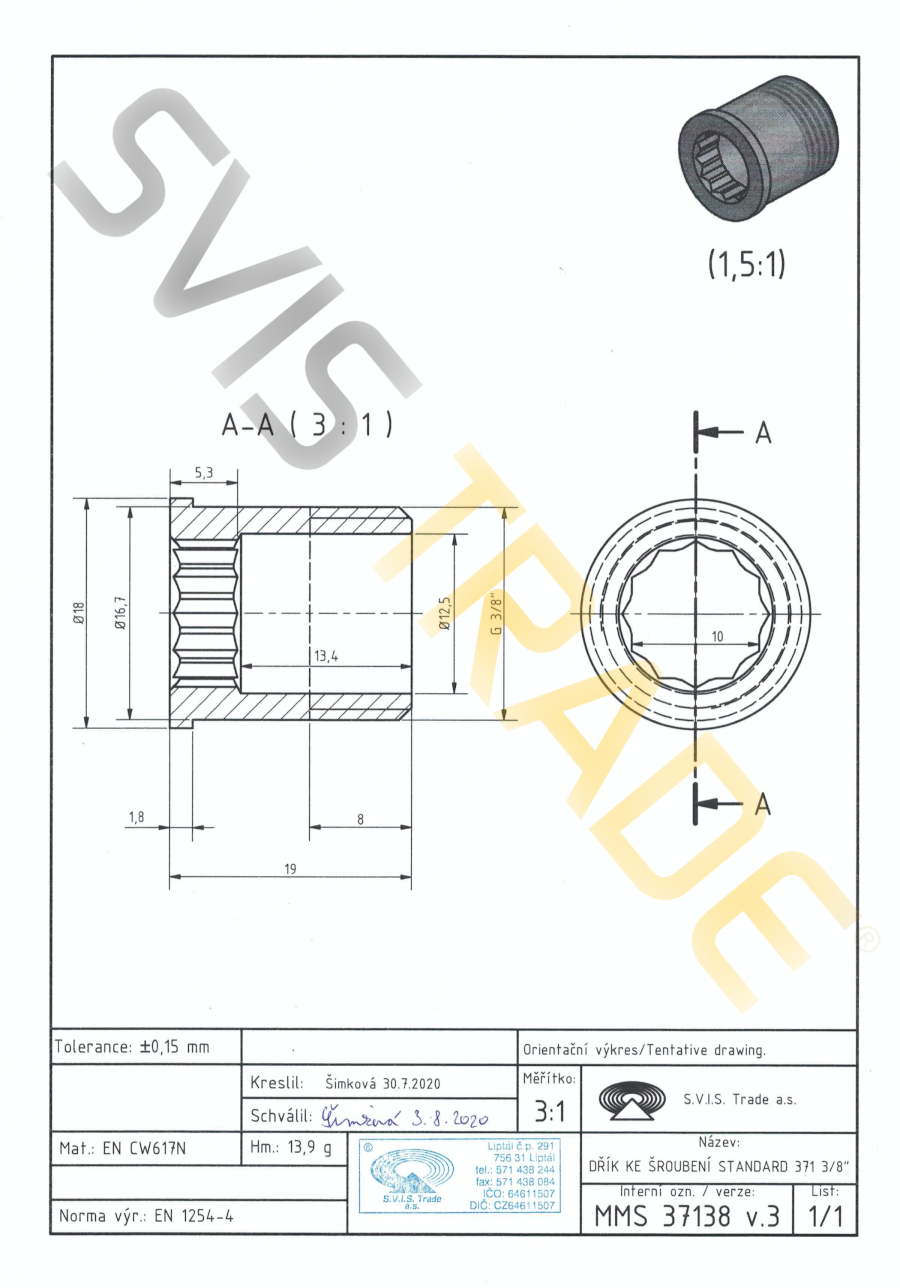 Závitová tvarovka z mosadze, druh - diel šróbenie, nátrubok oporný s rúrkovým pripojovacím závitom vonkajším, bez povrchovej úpravy. Pripojovacie závity G sú valcové pre spoje netesniace na závitoch podľa normy ISO 228-1. Vyrobené podľa normy EN 1254-4.