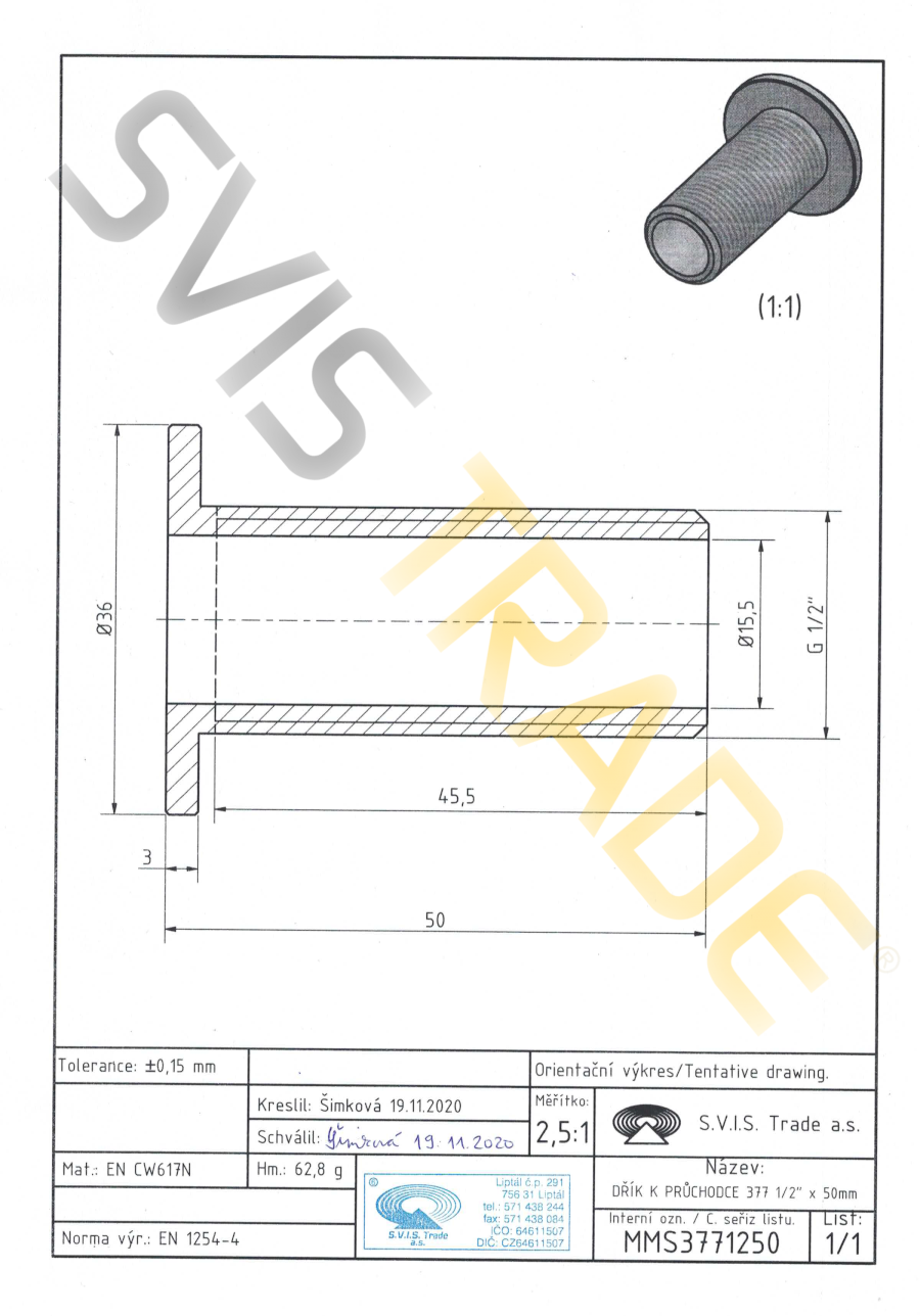 Mosazná průchodka k nádrži - díl dřík M – 377 MMS - STANDARD. Vyrobeno dle EN 1254-4 závitová mosazná tvarovka – průchodka k nádrži - díl dřík s trubkovými válcovým závitem G vnější dle ISO 228-1. Bez povrchové úpravy.