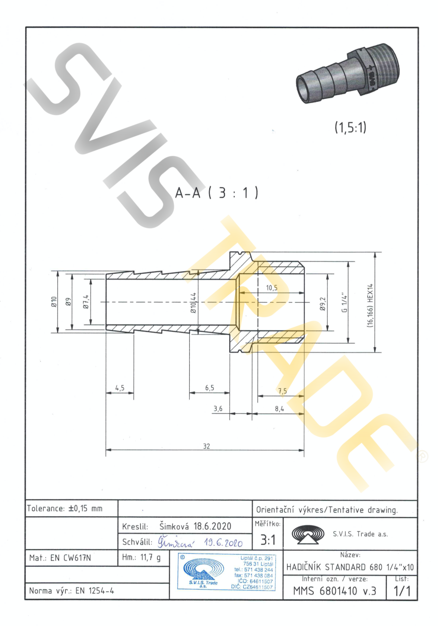 Tvarovka z mosadze CW617N. Určená pre spájanie so závitom ISO 228-1. Prevedenie: bez povrchovej úpravy.