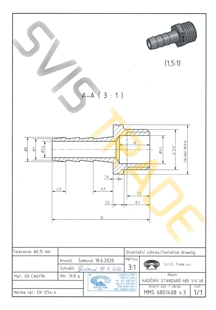 Tvarovka z mosadze CW617N. Určená pre spájanie so závitom ISO 228-1. Prevedenie: bez povrchovej úpravy.