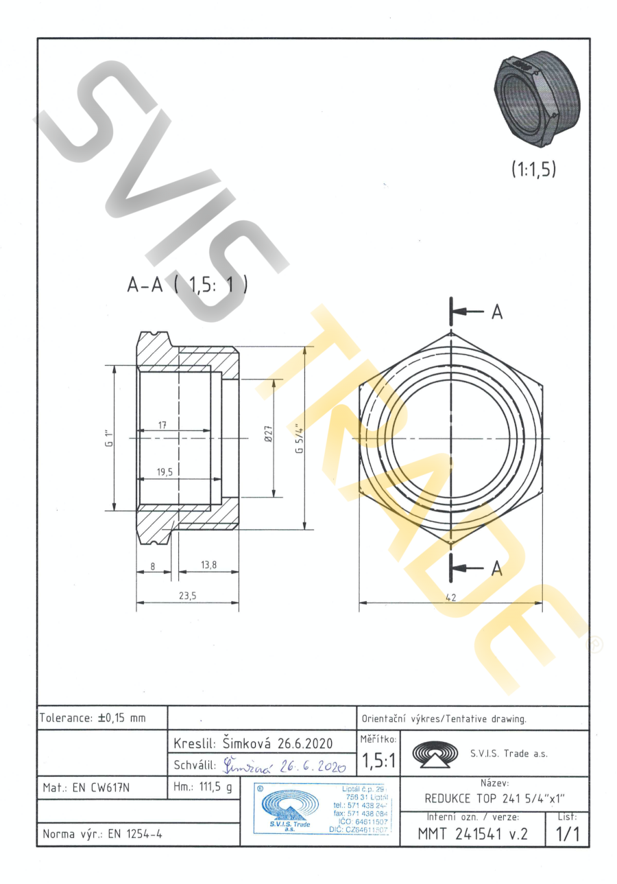 Závitová tvarovka z mosadze, druh - redukcia (prechod) s rúrkovými závitmi vnútorné x vonkajšie, bez povrchovej úpravy. Závity sú valcové pre spoje netesniace na závitoch podľa normy ISO 228-1. Vyrobené podľa normy EN 1254-4.