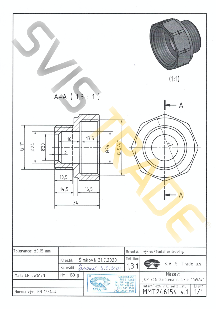 Závitová tvarovka z mosadze, druh - vsuvka redukovaná s rúrkovými závitmi vonkajšie x vonkajšie, bez povrchovej úpravy. Závity sú valcové pre spoje netesniace na závitoch podľa normy ISO 228-1. Vyrobené podľa normy EN 1254-4.