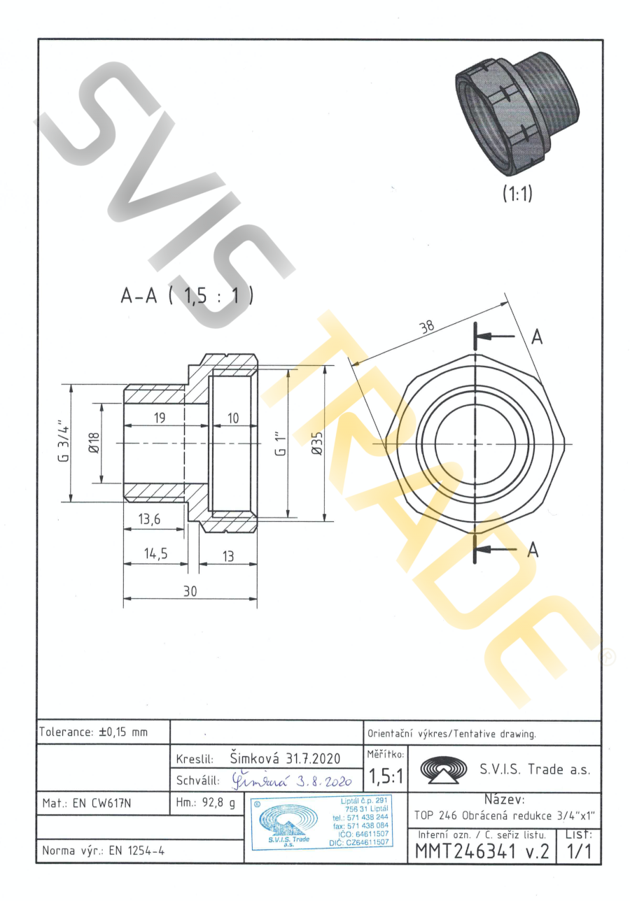 Závitová tvarovka z mosadze, druh - vsuvka redukovaná s rúrkovými závitmi vonkajšie x vonkajšie, bez povrchovej úpravy. Závity sú valcové pre spoje netesniace na závitoch podľa normy ISO 228-1. Vyrobené podľa normy EN 1254-4.
