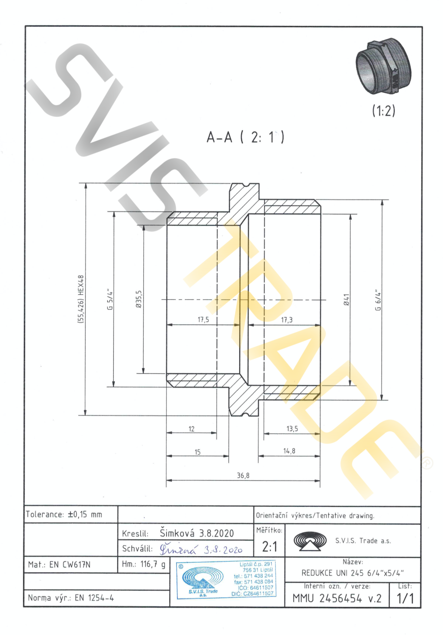 Závitová tvarovka z mosadze, druh - vsuvka redukovaná s rúrkovými závitmi vonkajšie x vonkajšie, bez povrchovej úpravy. Závity sú valcové pre spoje netesniace na závitoch podľa normy ISO 228-1. Vyrobené podľa normy EN 1254-4.
