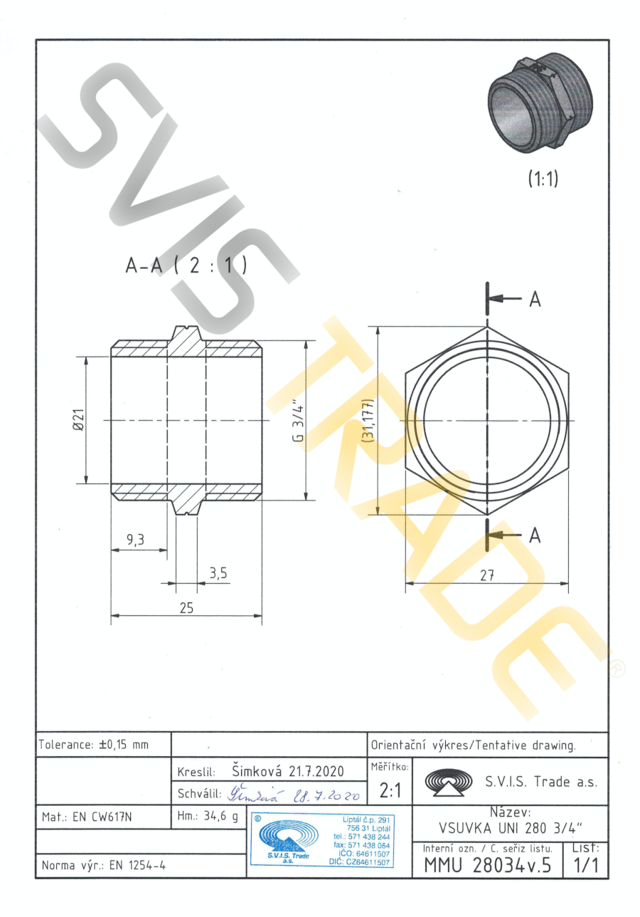 Závitová tvarovka z mosadze, druh - vsuvka s 6-hranom, s rúrkovými závitmi vonkajšie x vonkajšie, bez povrchovej úpravy. Pripojovacie závity G sú valcové pre spoje netesniace na závitoch podľa normy ISO 228-1. Vyrobené podľa normy EN 1254-4.