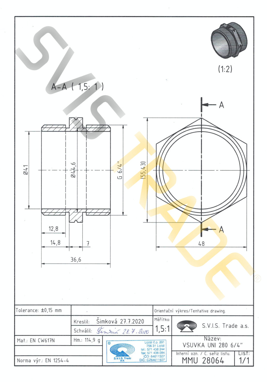 Závitová tvarovka z mosadze, druh - vsuvka s 6-hranom, s rúrkovými závitmi vonkajšie x vonkajšie, bez povrchovej úpravy. Pripojovacie závity G sú valcové pre spoje netesniace na závitoch podľa normy ISO 228-1. Vyrobené podľa normy EN 1254-4.