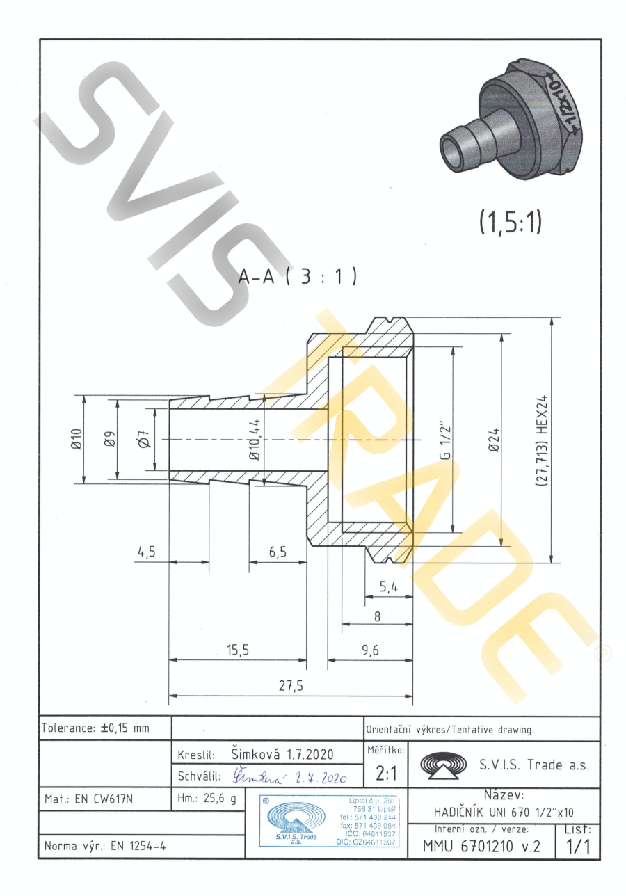 Tvarovka z mosadze CW617N. Určená pre spájanie so závitom ISO 228-1. Prevedenie: bez povrchovej úpravy.
