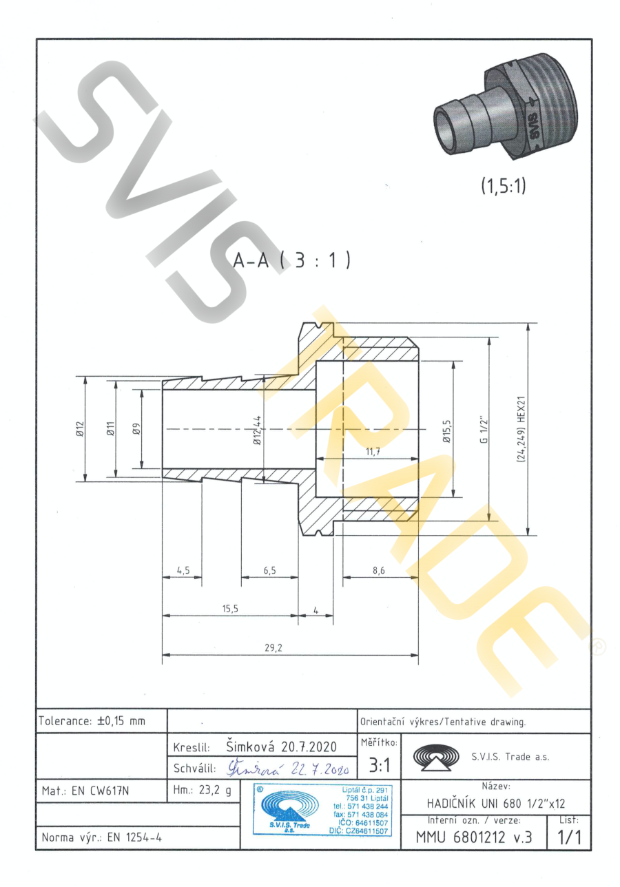 Tvarovka z mosadze CW617N. Určená pre spájanie so závitom ISO 228-1. Prevedenie: bez povrchovej úpravy.