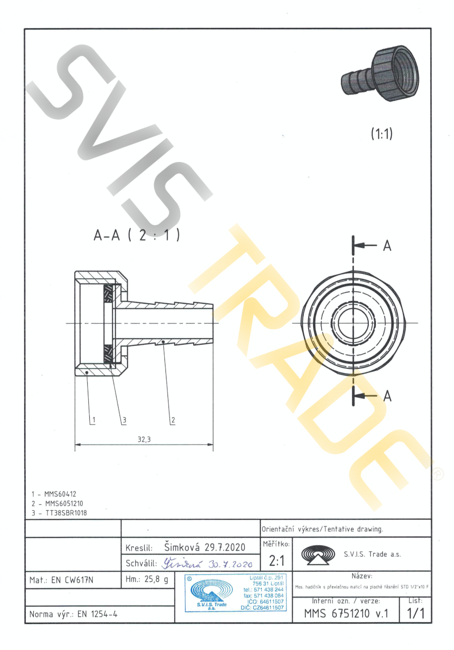 Mosazný hadičník s převlečnou maticí F – 675 MMS - STANDARD. Vyrobeno dle EN 1254-4 závitová mosazná tvarovka – mosazný hadičník s převlečnou maticí (nástavec na hadici) s trubkovým válcovým závitem G vnitřní dle ISO 228-1. Bez povrchové úpravy.