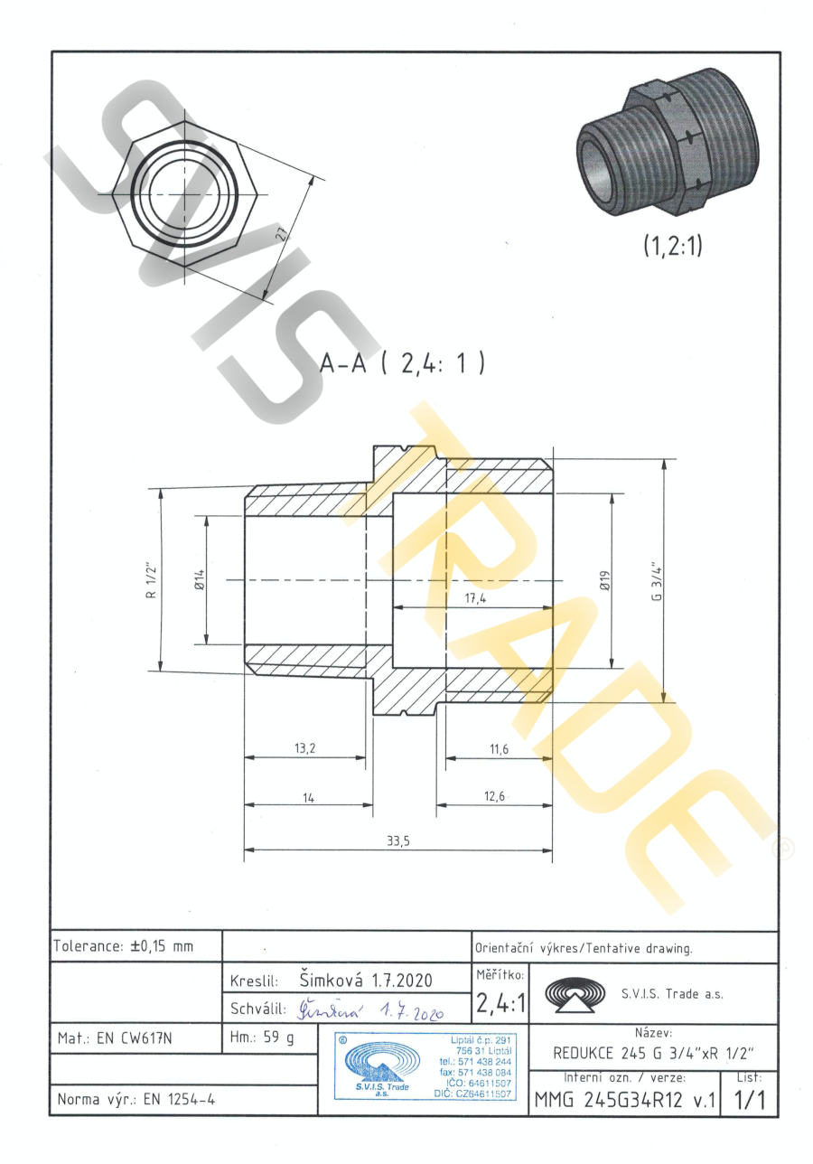Navojni mesingani fiting, tip – Nipl sa heksagonom sa cijevnim navojima vanjski-vanjski, bez površinske obrade. Spojni navoj G paralelan je spajanju, ne brtvljenju, na navoje sukladno ISO 288-1. Proizvedeno prema normi EN 1254-4.