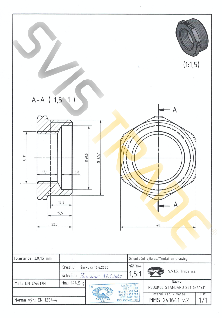 Navojni mesingani fiting, tip – Redukcija sa cijevnim navojima unutarnji-vanjski, bez površinske obrade. Spojni navoj G paralelan je spajanju, ne brtvljenju, na navoje sukladno ISO 288-1. Proizvedeno prema normi EN 1254-4.