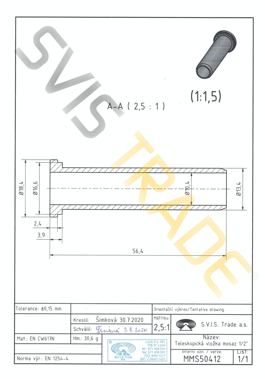 Ugradnja mesinga, tip - dio teleskopske armature, povlačenje umetka s navojem, bez navoja. Bez površinske obrade. Spojni navoji G cilindrični su za navojne priključke prema ISO 228-1. Izrađen prema EN 1254-4.