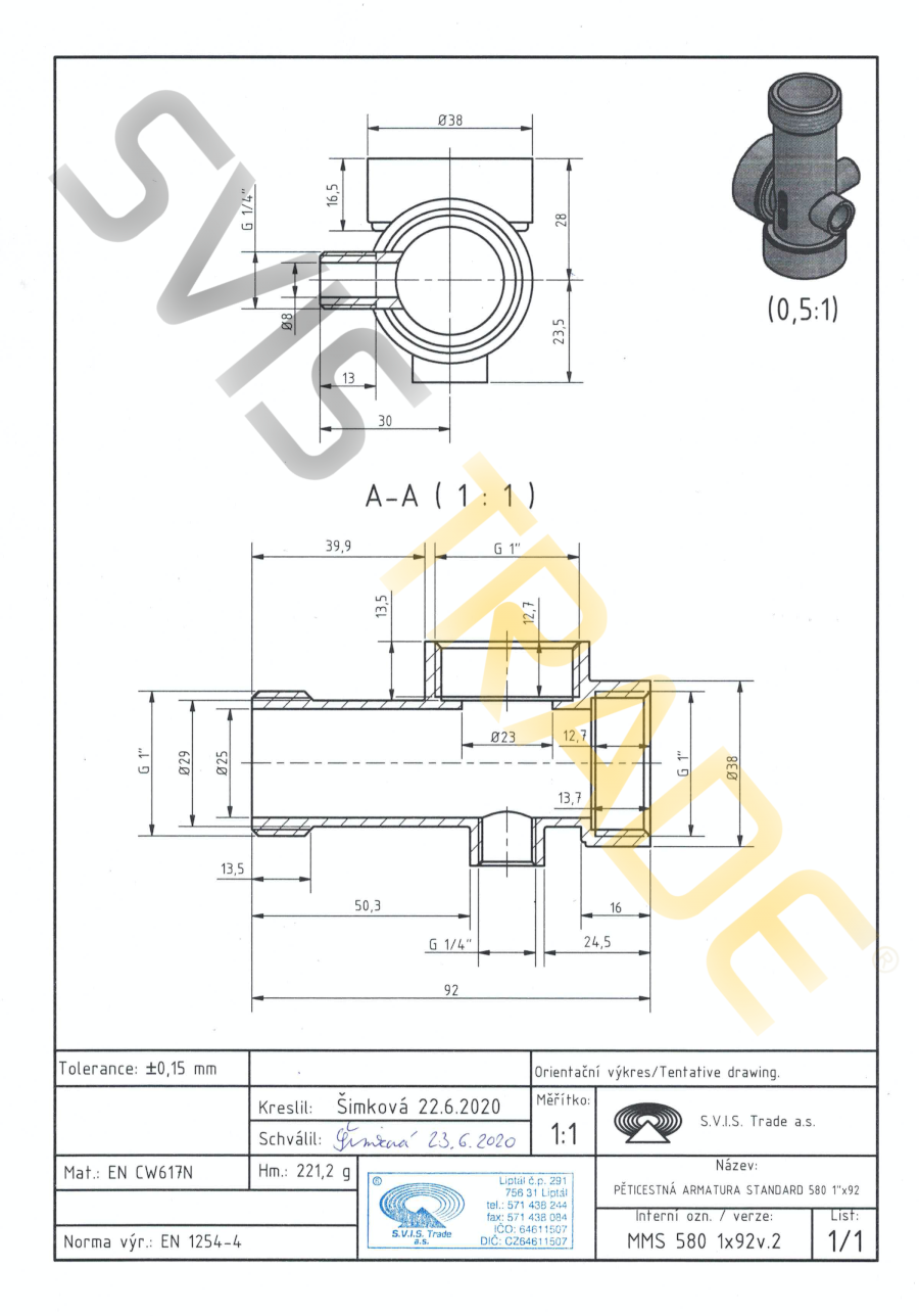 Pěticestná armatura k domácím vodárnám a  závlahovým systémům FFFMM – 580 MMS - STANDARD. Vyrobeno dle EN 1254-4. Závitová mosazná tvarovka – 5-cestný spojovací modul 3 x vnitřní závit G 1" (pro vstup tlakové vody, napojení výstupu vody např. na domovní rozvod a připojení tlakové nádoby) a 2 x vnější závit G 1/4" (pro manometr a tlakový spínač). Závity jsou trubkové válcové netěsnící na závitu podle ISO 228-1. Bez povrchové úpravy.