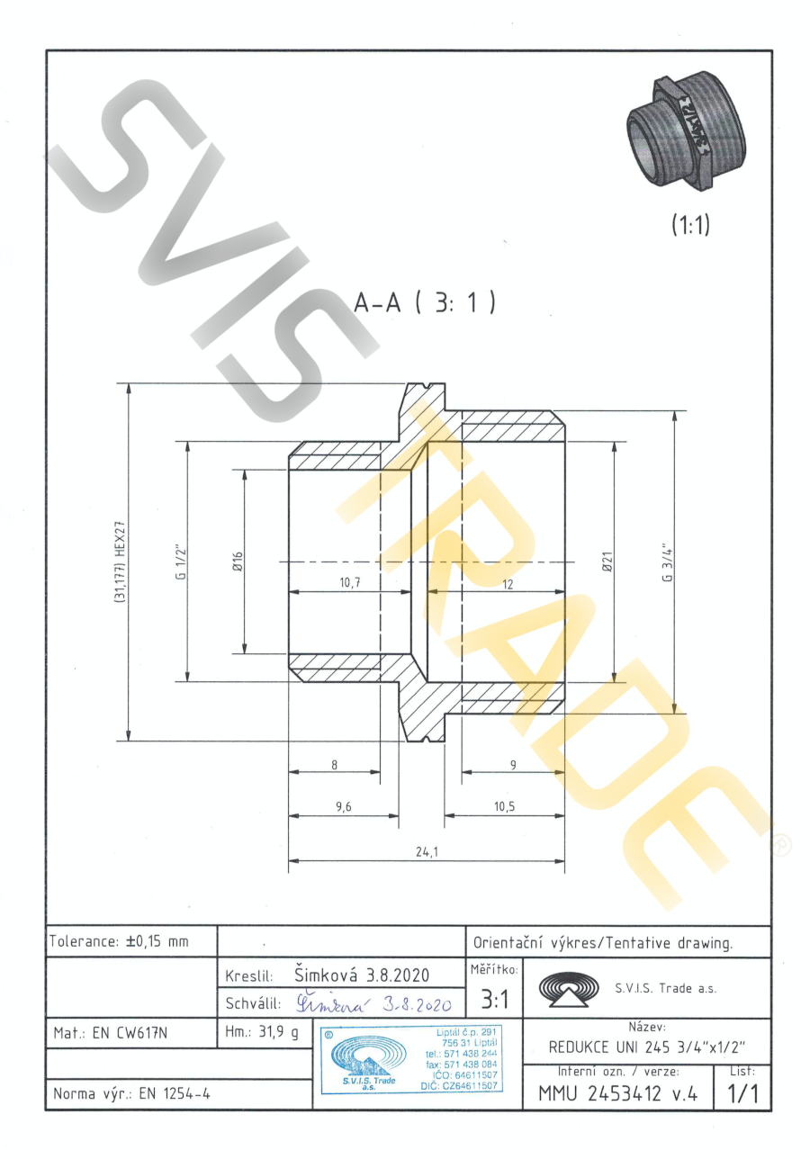 Navojni mesingani fiting, tip – Nipl reducirani sa cijevnim navojima vanjski-vanjski, bez površinske obrade. Spojni navoj G paralelan je spajanju, ne brtvljenju, na navoje sukladno ISO 288-1. Proizvedeno prema normi EN 1254-4.