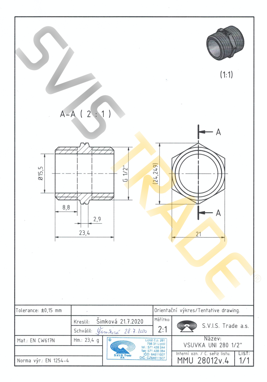 Navojni mesingani fiting, tip – Nipl sa heksagonom sa cijevnim navojima vanjski-vanjski, bez površinske obrade. Spojni navoj G paralelan je spajanju, ne brtvljenju, na navoje sukladno ISO 288-1. Proizvedeno prema normi EN 1254-4.