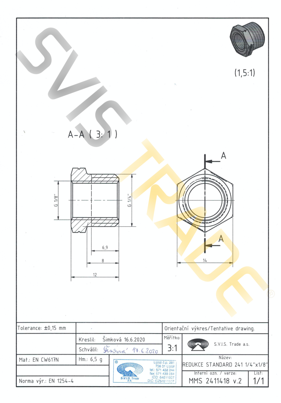 Menetes sárgaréz idom, szűkítő belső külső csőmenettel, felületi kezelés nélkül. Hengeres G menettel, ahol a tömítés nem a menetben van - ISO 228-1 norma szerint. Gyártása az EN 1254-4 szerint történik. S.V.I.S. Trade Kft. - menetes idomok Csehországi gyártója , az ISO 9001, ISO 14001, OHSAS 18001 tanúsítványok tulajdonosa. A sárgaréz idomok meghibásodása okozta károkra, biztosítás van érvényben az egész EU területén. A fittingek felhasználhatóak levegő, víz, ivóvíz , nem abrazív és nem agresszív anyagokat tartalmazó rendszerekhez, 1,6MP nyomás értékig és -20°C tól 120°C feltételek mellett , miközben biztosított az anyagok fagyállósága. A STANDARD minőségben előállitott fittingek magasabb követelményeknek felelnek meg a menetek szempontjából. A sárgaréz idomok a CW617N minőségi réz anyagból vannak előállitva. A gyártó a fittingek tömítéséhez tefloncsík illetve teflon tömítőzsinór használatát javasolja. A gyártó NEM AJÁNLJA a kenderből készült tömítések használatát sárgaréz fittingjeihez. A gyártó ajánlata felhasználáshoz, szereléshez: víz és ivóvíz rendszerekhez, központi fűtéshez, levegő fűtéses rendszerekhez.