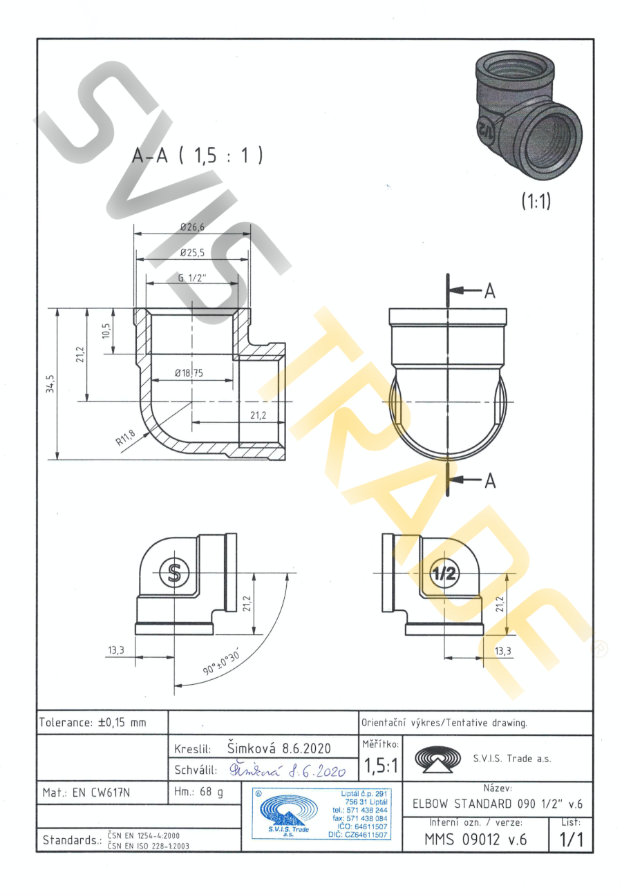Mosiężne kolano FF - 090 MMS-STANDARD. Wyprodukowana według normy EN 1254-4 - gwintowana mosiężna złączka. Bez obróbki powierzchniowej. S.V.I.S Trade-czeski producent kształtek jest posiadaczem certyfikatów ISO 9001,ISO 14001,OHSAS 18001. Na mosiężne kształtki stosujemy ubezpieczenie szkody na całym terytorium EU. Zaprojektowane do dystrybucji wody,wody pitnej,powietrza,nieabrazyjne i nie agresywne media do dopuszczalnego ciśnienia 1,6 MPa i temperatury od -20°C do 120 °C, z koniecznością uniknięcia zamrożenia mediów. Seria kształtek STANDARD-spełnia wyższe wymagania dla połączeń gwintowanych. Mosiężne kształtki są produkowane z mosiądzu CW617 N. Jako materiał uszczelniający do montażu złączek mosiężnych zaleca się uzywanie taśmy teflonowej lub przewodu teflonowego. Producent NIE ZALECA używania konopi jako materiał uszczelniający. Zalecenia dla instalacji: dystrybucja wody,dystrybucja wody pitnej,dystrybucja ciepła,powietrza.