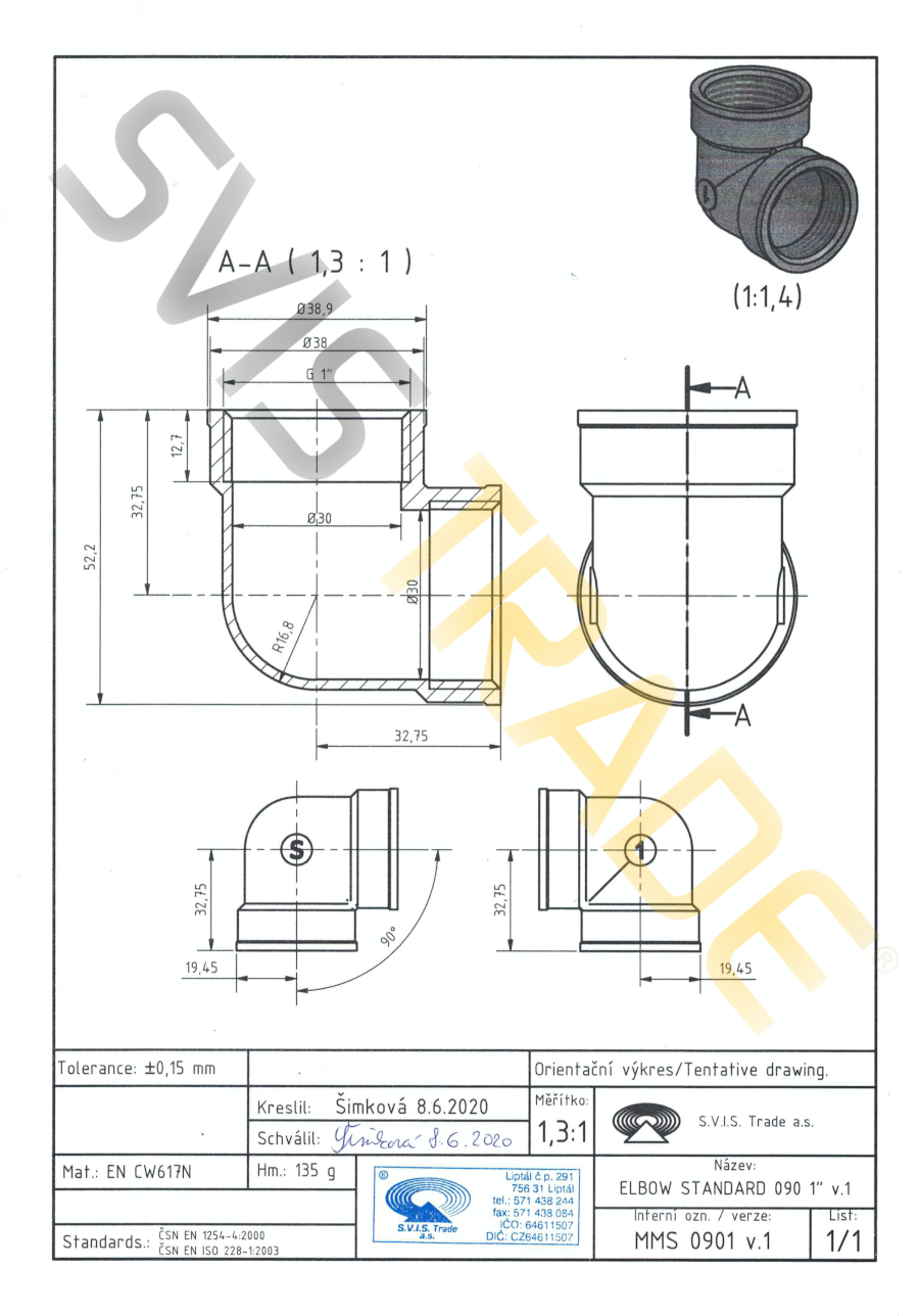 Mosiężne kolano FF - 090 MMS-STANDARD. Wyprodukowana według normy EN 1254-4 - gwintowana mosiężna złączka. Bez obróbki powierzchniowej. S.V.I.S Trade-czeski producent kształtek jest posiadaczem certyfikatów ISO 9001,ISO 14001,OHSAS 18001. Na mosiężne kształtki stosujemy ubezpieczenie szkody na całym terytorium EU. Zaprojektowane do dystrybucji wody,wody pitnej,powietrza,nieabrazyjne i nie agresywne media do dopuszczalnego ciśnienia 1,6 MPa i temperatury od -20°C do 120 °C, z koniecznością uniknięcia zamrożenia mediów. Seria kształtek STANDARD-spełnia wyższe wymagania dla połączeń gwintowanych. Mosiężne kształtki są produkowane z mosiądzu CW617 N. Jako materiał uszczelniający do montażu złączek mosiężnych zaleca się uzywanie taśmy teflonowej lub przewodu teflonowego. Producent NIE ZALECA używania konopi jako materiał uszczelniający. Zalecenia dla instalacji: dystrybucja wody,dystrybucja wody pitnej,dystrybucja ciepła,powietrza.