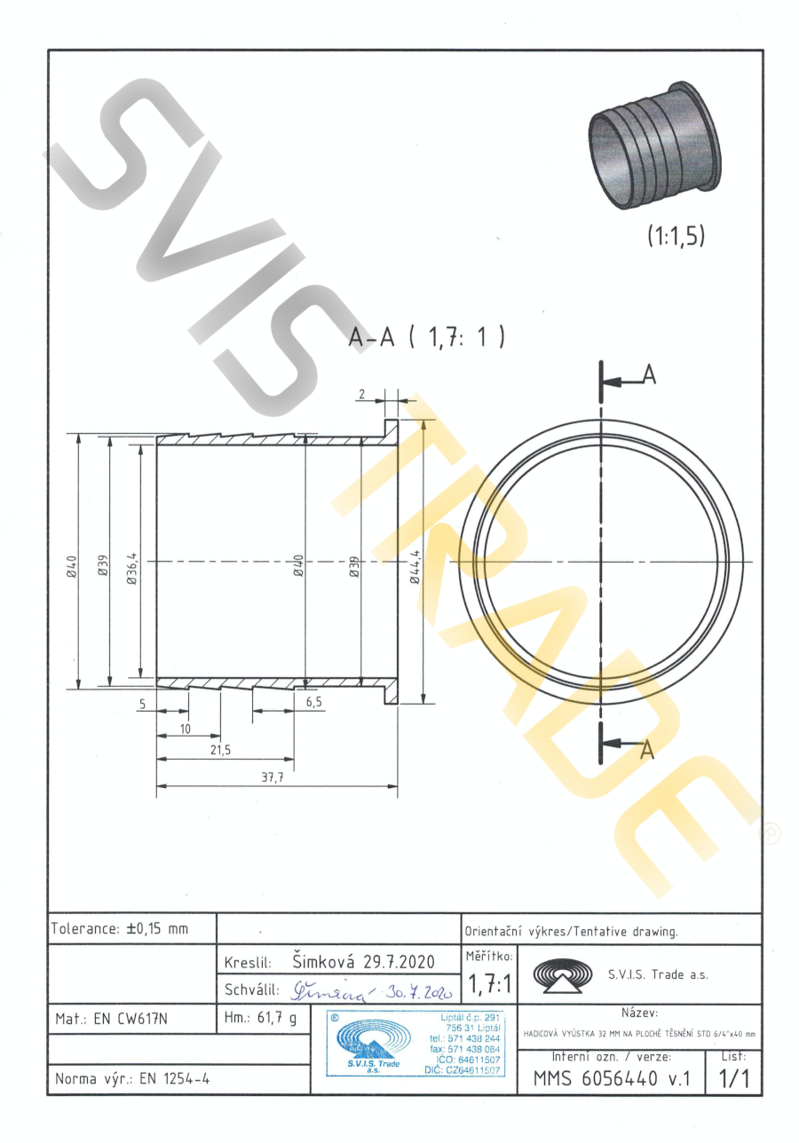Mosiężne złącze do węża z uszczelnieniem płaskim - 605 MMS-STANDARD. Wyprodukowana według normy EN 1254-4 - gwintowana mosiężna złączka. Bez obróbki powierzchniowej. S.V.I.S Trade-czeski producent kształtek jest posiadaczem certyfikatów ISO 9001,ISO 14001,OHSAS 18001. Na mosiężne kształtki stosujemy ubezpieczenie szkody na całym terytorium EU. Zaprojektowane do dystrybucji wody,wody pitnej,powietrza,nieabrazyjne i nie agresywne media do dopuszczalnego ciśnienia 1,6 MPa i temperatury od -20°C do 120 °C, z koniecznością uniknięcia zamrożenia mediów. Seria kształtek STANDARD-spełnia wyższe wymagania dla połączeń gwintowanych. Mosiężne kształtki są produkowane z mosiądzu CW617 N. Jako materiał uszczelniający do montażu złączek mosiężnych zaleca się uzywanie taśmy teflonowej lub przewodu teflonowego. Producent NIE ZALECA używania konopi jako materiał uszczelniający. Zalecenia dla instalacji: dystrybucja wody,dystrybucja wody pitnej,dystrybucja ciepła,powietrza.