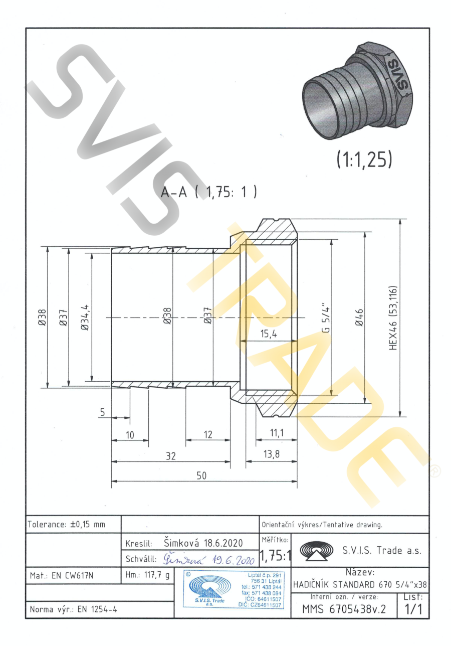 Mosiężna złączka do węża F - 670 MMS-STANDARD. Wyprodukowana według normy EN 1254-4 - gwintowana mosiężna złączka. Bez obróbki powierzchniowej. S.V.I.S Trade-czeski producent kształtek jest posiadaczem certyfikatów ISO 9001,ISO 14001,OHSAS 18001. Na mosiężne kształtki stosujemy ubezpieczenie szkody na całym terytorium EU. Zaprojektowane do dystrybucji wody,wody pitnej,powietrza,nieabrazyjne i nie agresywne media do dopuszczalnego ciśnienia 1,6 MPa i temperatury od -20°C do 120 °C, z koniecznością uniknięcia zamrożenia mediów. Seria kształtek STANDARD-spełnia wyższe wymagania dla połączeń gwintowanych. Mosiężne kształtki są produkowane z mosiądzu CW617 N. Jako materiał uszczelniający do montażu złączek mosiężnych zaleca się uzywanie taśmy teflonowej lub przewodu teflonowego. Producent NIE ZALECA używania konopi jako materiał uszczelniający. Zalecenia dla instalacji: dystrybucja wody,dystrybucja wody pitnej,dystrybucja ciepła,powietrza.