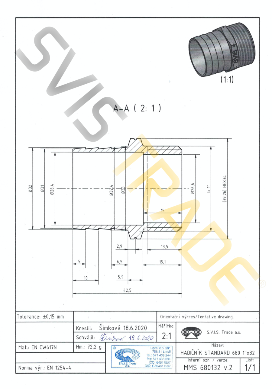 Mosiężna złączka do węża M - 680 MMS-STANDARD. Wyprodukowana według normy EN 1254-4 - gwintowana mosiężna złączka. Bez obróbki powierzchniowej. S.V.I.S Trade-czeski producent kształtek jest posiadaczem certyfikatów ISO 9001,ISO 14001,OHSAS 18001. Na mosiężne kształtki stosujemy ubezpieczenie szkody na całym terytorium EU. Zaprojektowane do dystrybucji wody,wody pitnej,powietrza,nieabrazyjne i nie agresywne media do dopuszczalnego ciśnienia 1,6 MPa i temperatury od -20°C do 120 °C, z koniecznością uniknięcia zamrożenia mediów. Seria kształtek STANDARD-spełnia wyższe wymagania dla połączeń gwintowanych. Mosiężne kształtki są produkowane z mosiądzu CW617 N. Jako materiał uszczelniający do montażu złączek mosiężnych zaleca się uzywanie taśmy teflonowej lub przewodu teflonowego. Producent NIE ZALECA używania konopi jako materiał uszczelniający. Zalecenia dla instalacji: dystrybucja wody,dystrybucja wody pitnej,dystrybucja ciepła,powietrza.