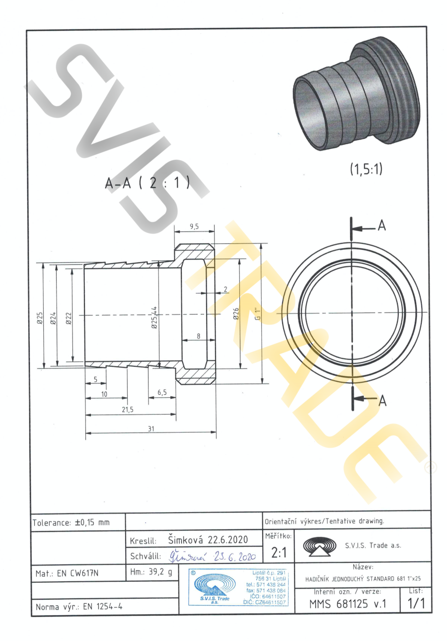 Mosiężny adapter prosty do węża M - 681 MMS-STANDARD. Wyprodukowana według normy EN 1254-4 - gwintowana mosiężna złączka. Bez obróbki powierzchniowej. S.V.I.S Trade-czeski producent kształtek jest posiadaczem certyfikatów ISO 9001,ISO 14001,OHSAS 18001. Na mosiężne kształtki stosujemy ubezpieczenie szkody na całym terytorium EU. Zaprojektowane do dystrybucji wody,wody pitnej,powietrza,nieabrazyjne i nie agresywne media do dopuszczalnego ciśnienia 1,6 MPa i temperatury od -20°C do 120 °C, z koniecznością uniknięcia zamrożenia mediów. Seria kształtek STANDARD-spełnia wyższe wymagania dla połączeń gwintowanych. Mosiężne kształtki są produkowane z mosiądzu CW617 N. Jako materiał uszczelniający do montażu złączek mosiężnych zaleca się uzywanie taśmy teflonowej lub przewodu teflonowego. Producent NIE ZALECA używania konopi jako materiał uszczelniający. Zalecenia dla instalacji: dystrybucja wody,dystrybucja wody pitnej,dystrybucja ciepła,powietrza.