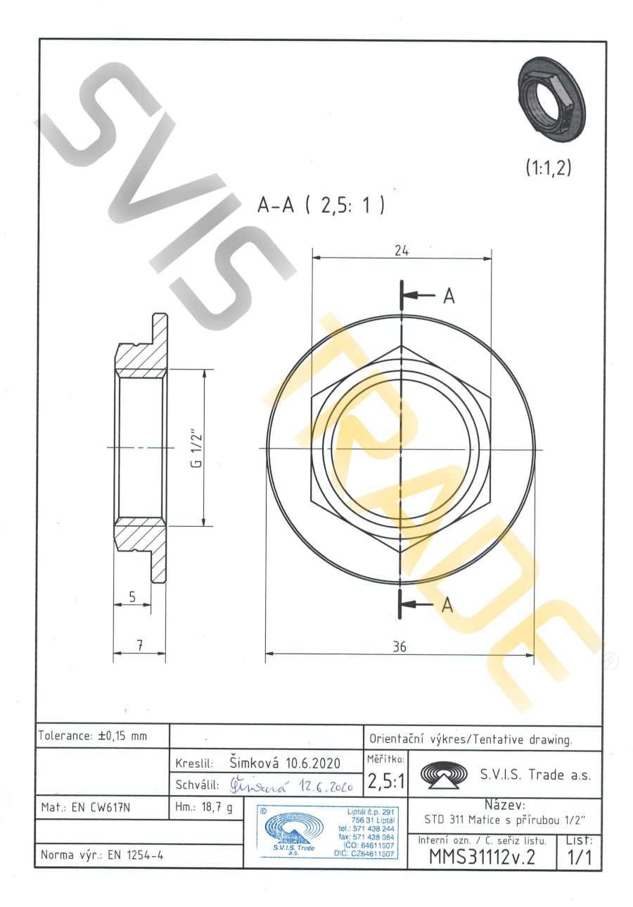 Mosazná matice s přírubou MM – 311 MMS - STANDARD. Vyrobeno dle EN 1254-4 závitová mosazná tvarovka – matice mosazná s přírubou s trubkovým válcovým závitem G vnitřním dle ISO 228-1. Bez povrchové úpravy.