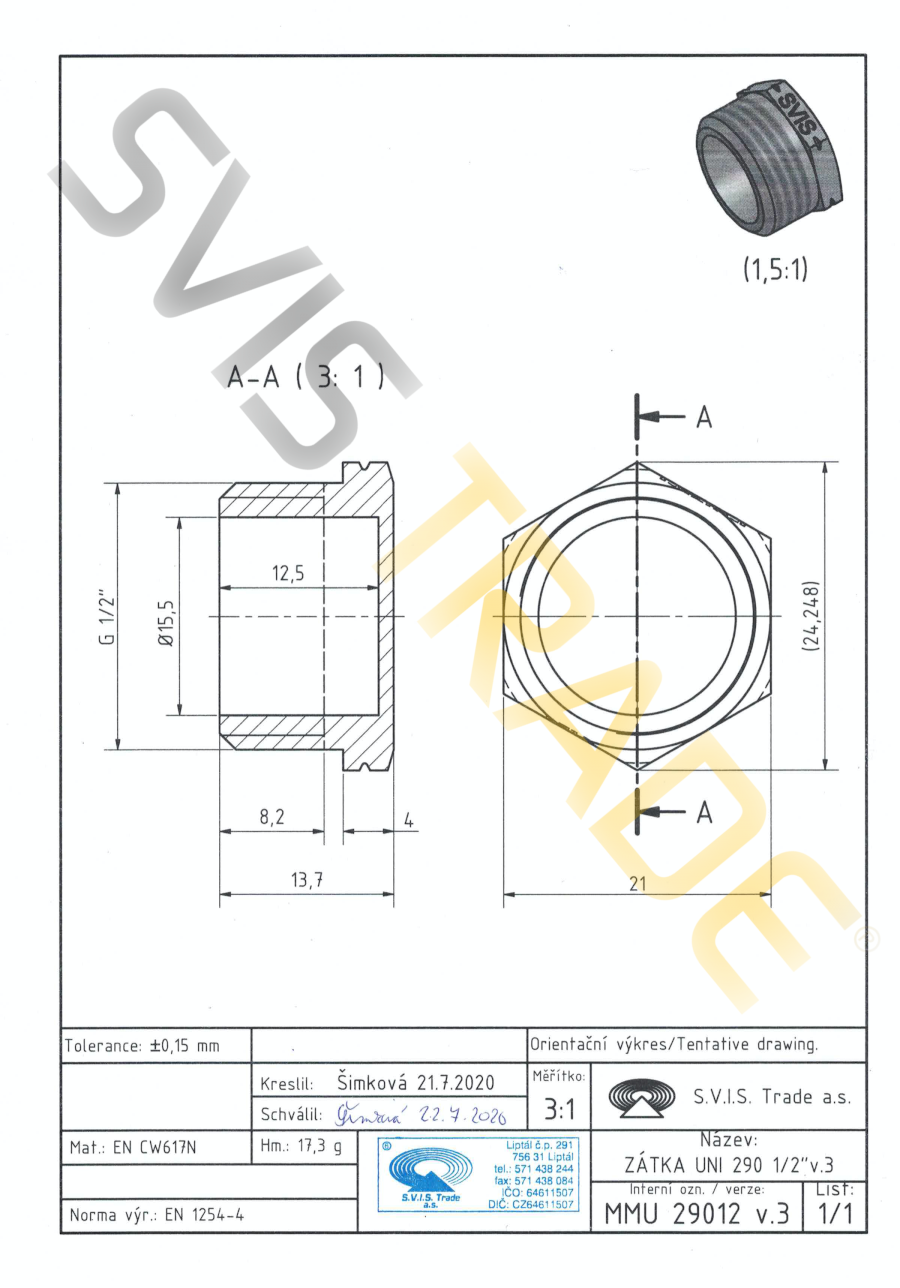 Filetul fitingurilor din alama,tip-dop cu hexagon,cu filetele tevii exterioare,fara tratament de suprafata.Conectarea filetelor G,sunt paralele pentru unirea(imbinarea) nu etansarea pe filete in conformitate cu ISO 228-1.Produse in conformitate cu EN 1254-4.