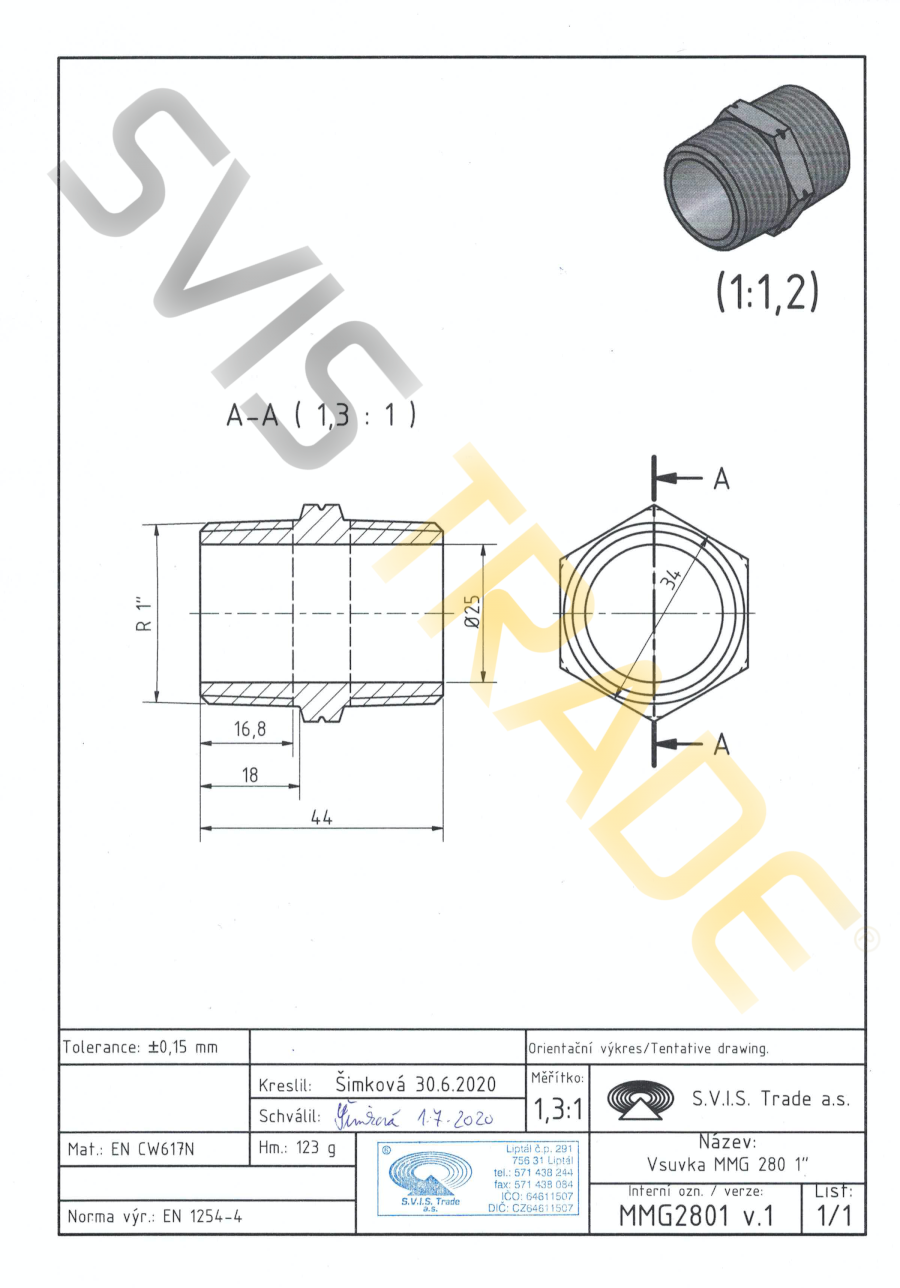 Závitová tvarovka z mosadze, druh - vsuvka s rúrkovými závitmi vonkajšie x vonkajšie, bez povrchovej úpravy. Pripojovacie závity sú R kónické tesniace na závitoch podl'a ISO 7-1. Vyrobené podl'a normy EN 1254-4.Voda a vodní roztoky: od 1/8" do 3/4" 2,5 MPa do 120 °C; 1,6MPa do 220°C od 1" do 4" 1,6 MPa do 120°C; 0,6 MPa do 220°CHorl'avé plyny: od 1/8" do 4" 0,5MPaTechnické plyny: od 1/8" do 4" 1,6 MPa nutnosť zamezit zamrznutí média.Použitie: Určené pre použitie v potrubných rozvodoch vody (vrátane vody určenej pre ľudskú spotrebu), vzduchu a ďalších neabrazívnych a neagresívnych médií s najvyšším pracovným pretlakom 1,6 MPa pri teplote media od 0 ° C do + 120 ° C.