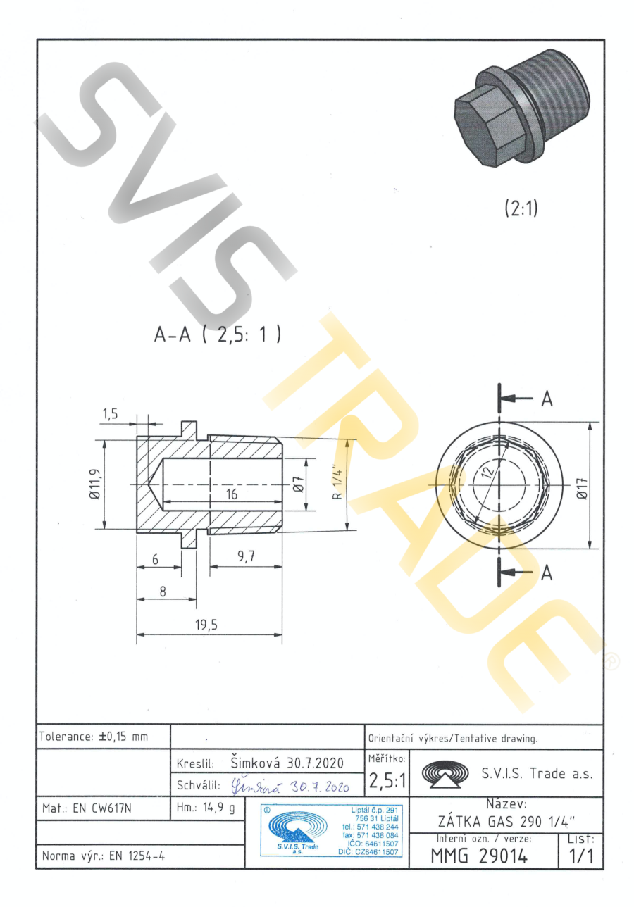 Závitová tvarovka z mosadze, druh - zátka s rúrkovým závitom vnútorným, bez povrchovej úpravy. Pripojovacie závity sú R kónické tesniace na závitoch podl'a ISO 7-1. Vyrobené podl'a normy EN 1254-4. Voda a vodní roztoky: od 1/8" do 3/4" 2,5 MPa do 120 °C; 1,6MPa do 220°C od 1" do 4" 1,6 MPa do 120°C; 0,6 MPa do 220°C Horl'avé plyny: od 1/8" do 4" 0,5MPa Technické plyny: od 1/8" do 4" 1,6 MPa nutnosť zamezit zamrznutí média. Použitie: Určené pre použitie v potrubných rozvodoch vody (vrátane vody určenej pre ľudskú spotrebu), vzduchu a ďalších neabrazívnych a neagresívnych médií s najvyšším pracovným pretlakom 1,6 MPa pri teplote media od 0 ° C do + 120 ° C.