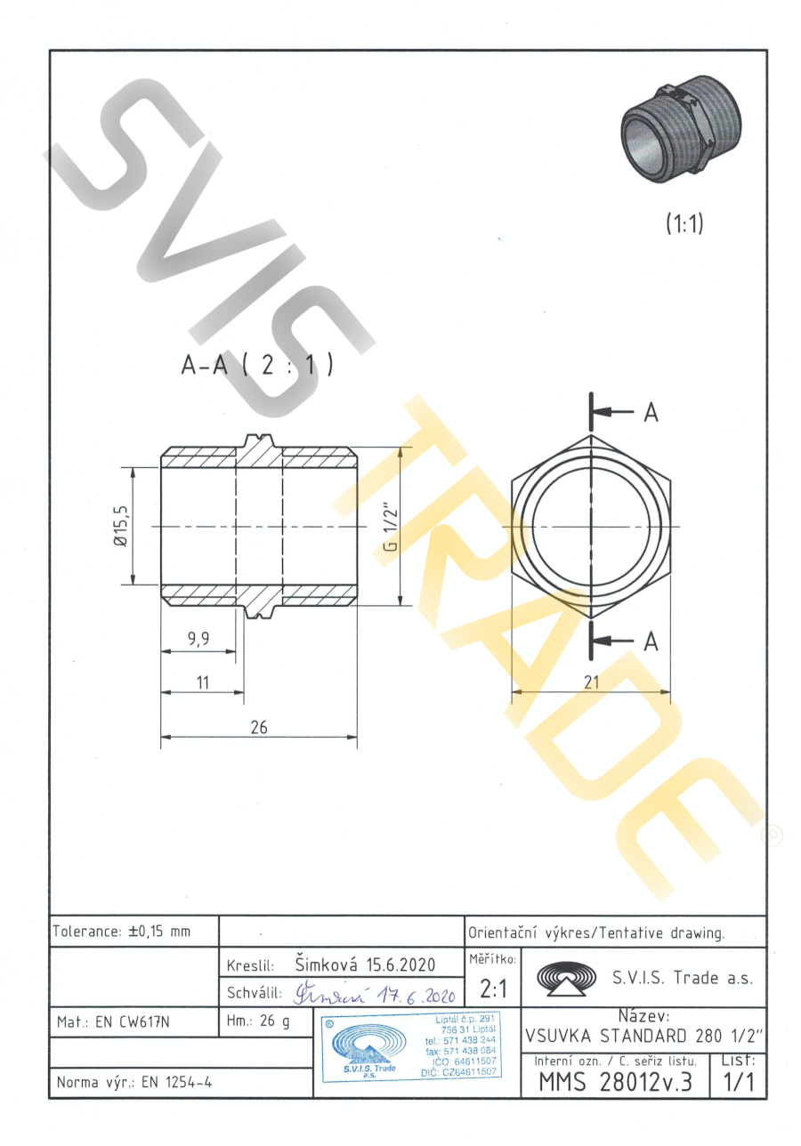 Závitová tvarovka z mosadze, druh - vsuvka s 6-hranom, s rúrkovými závitmi vonkajšie x vonkajšie, bez povrchovej úpravy. Pripojovacie závity G sú valcové pre spoje netesniace na závitoch podľa normy ISO 228-1. Vyrobené podľa normy EN 1254-4.