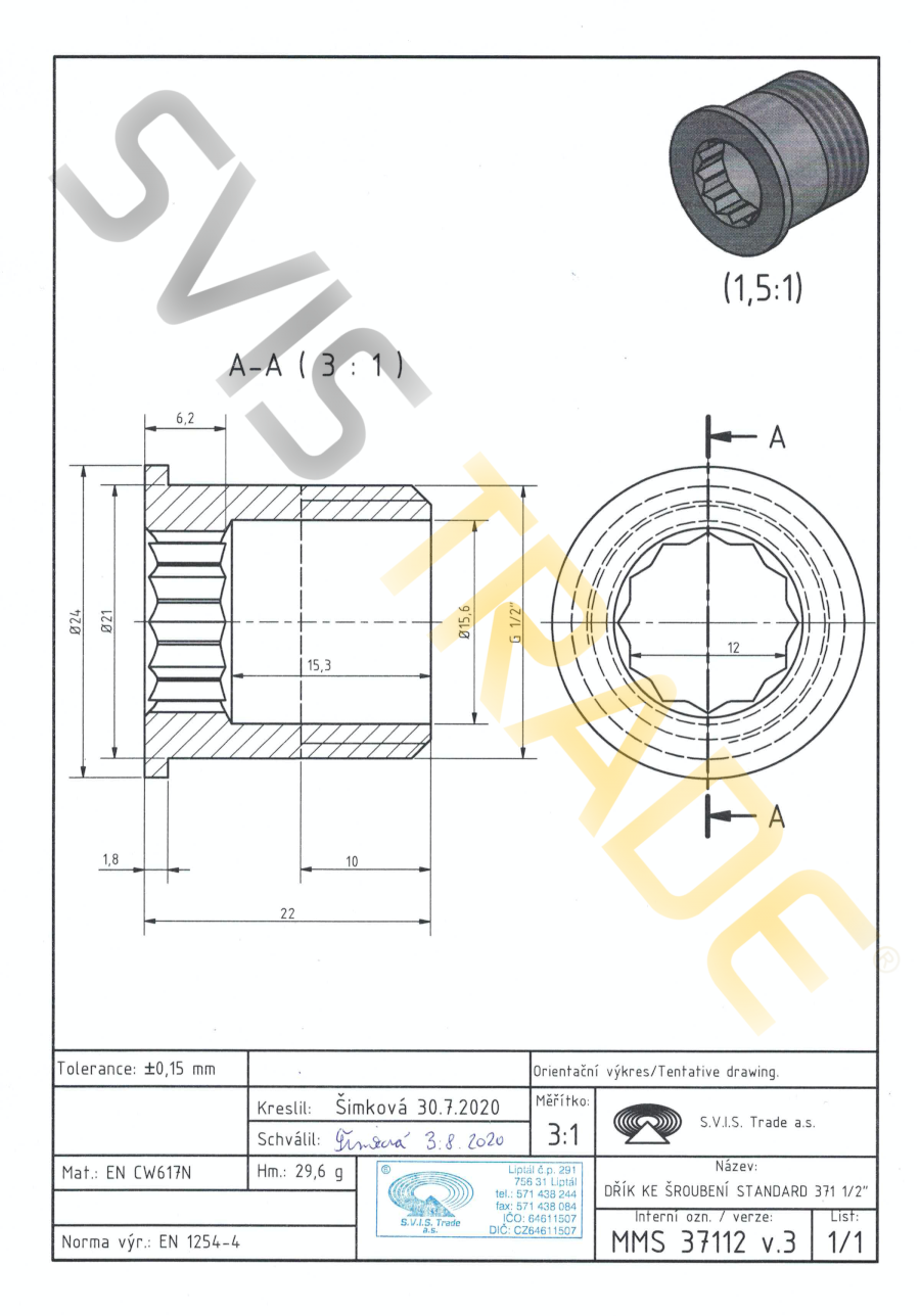 Závitová tvarovka z mosadze, druh - diel šróbenie, nátrubok oporný s rúrkovým pripojovacím závitom vonkajším, bez povrchovej úpravy. Pripojovacie závity G sú valcové pre spoje netesniace na závitoch podľa normy ISO 228-1. Vyrobené podľa normy EN 1254-4. Upozornenie: Šróbenie by malo byť použité len ako zmontovaný celok, pretože jednotlivé diely šróbenie rôznych výrobných značiek alebo jednotlivé diely rôznych typov a rovnakých výrobných značiek nemusí byť zameniteľné! Použitie: Určené pre použitie v potrubných rozvodoch vody (vrátane vody určenej pre ľudskú spotrebu), vzduchu a ďalších neabrazívnych a neagresívnych médií s najvyšším pracovným pretlakom 1,6 MPa pri teplote media od 0 ° C do + 120 ° C.