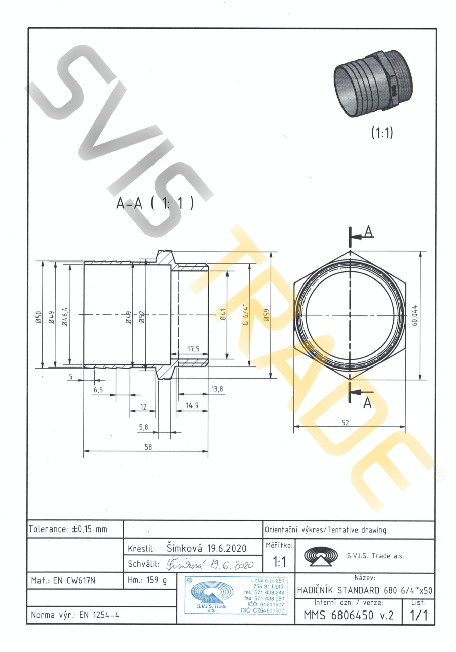 Tvarovka z mosadze CW617N. Určená pre spájanie so závitom ISO 228-1. Prevedenie: bez povrchovej úpravy.