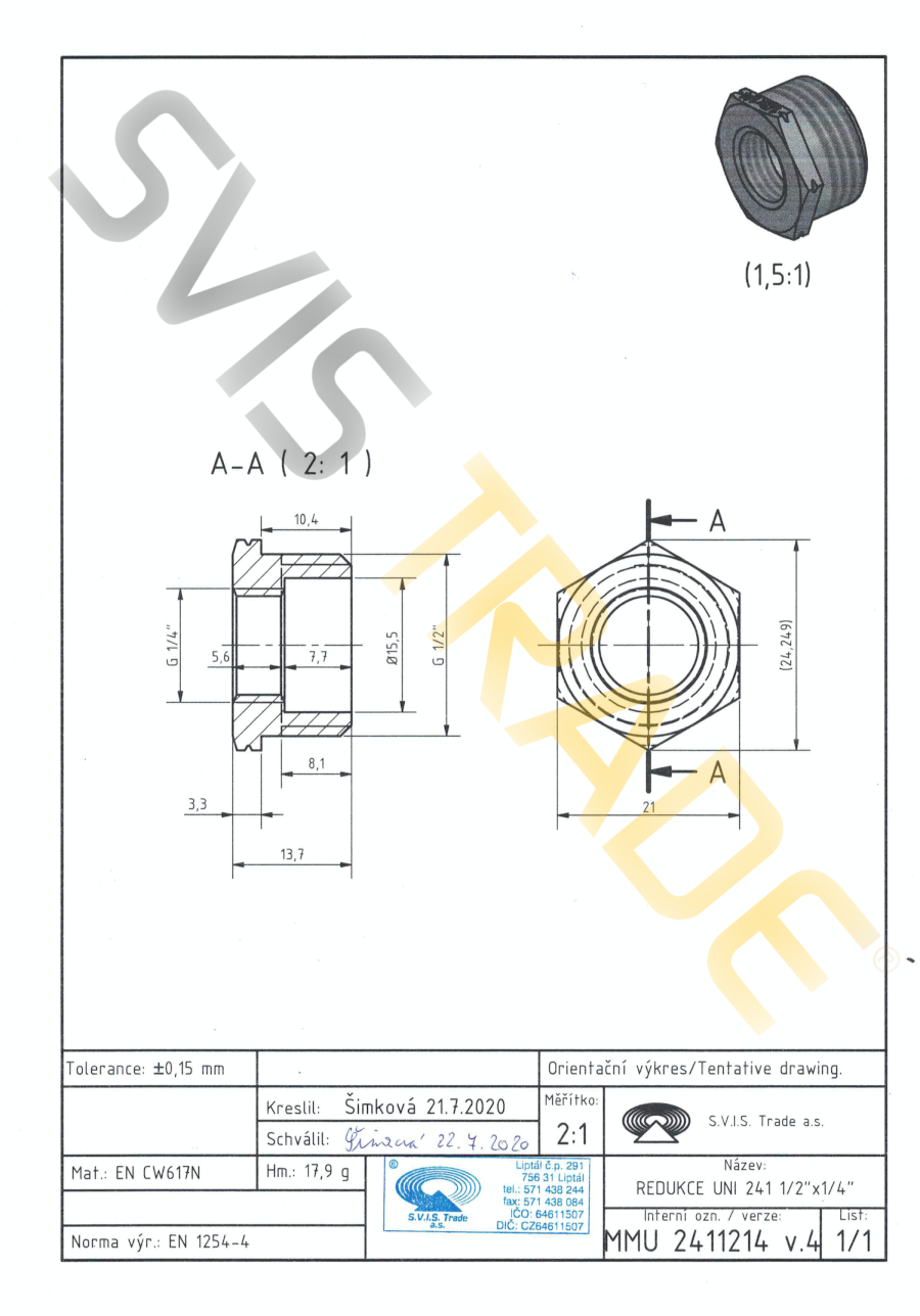 Závitová tvarovka z mosadze, druh - redukcia (prechod) s rúrkovými závitmi vnútorné x vonkajšie, bez povrchovej úpravy. Závity sú valcové pre spoje netesniace na závitoch podľa normy ISO 228-1. Vyrobené podľa normy EN 1254-4.