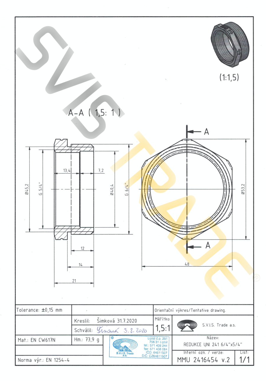 Závitová tvarovka z mosadze, druh - redukcia (prechod) s rúrkovými závitmi vnútorné x vonkajšie, bez povrchovej úpravy. Závity sú valcové pre spoje netesniace na závitoch podľa normy ISO 228-1. Vyrobené podľa normy EN 1254-4.