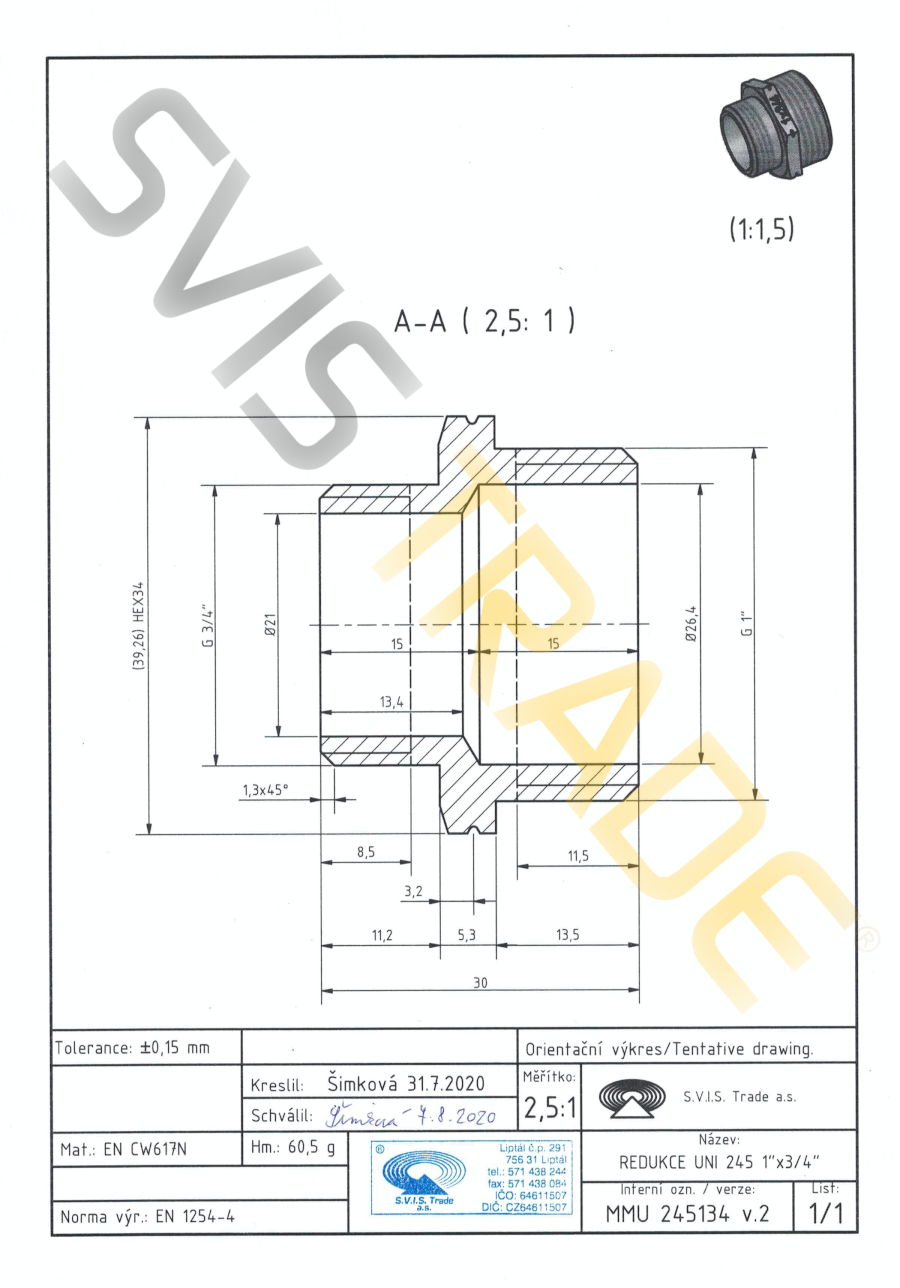Závitová tvarovka z mosadze, druh - vsuvka redukovaná s rúrkovými závitmi vonkajšie x vonkajšie, bez povrchovej úpravy. Závity sú valcové pre spoje netesniace na závitoch podľa normy ISO 228-1. Vyrobené podľa normy EN 1254-4.